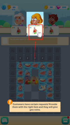 3、满足顾客:根据顾客的订单,提供正确的水果,赚取金币。
