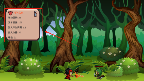 1、查看高阶属性:留意界面显示的“HP:224 法术强度:101 等级:21”,了解后期能力。