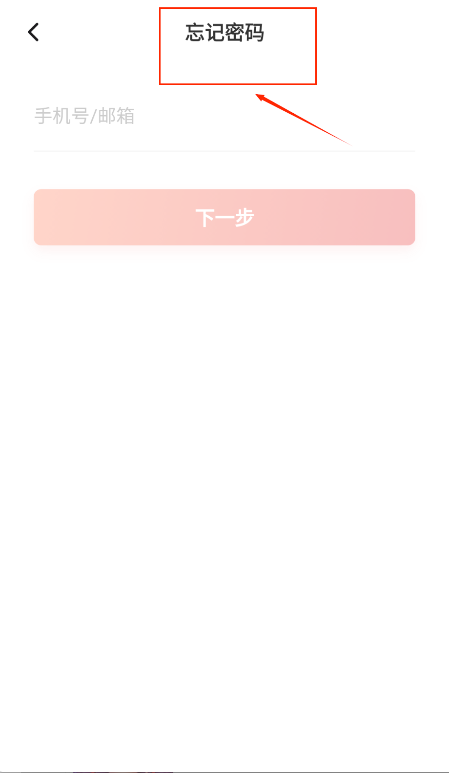 1、要找回密码的话先点开忘记密码页面,在"手机号/邮箱"框里准确输入注册时用的信息,核对无误后点击粉色"下一步"按钮。