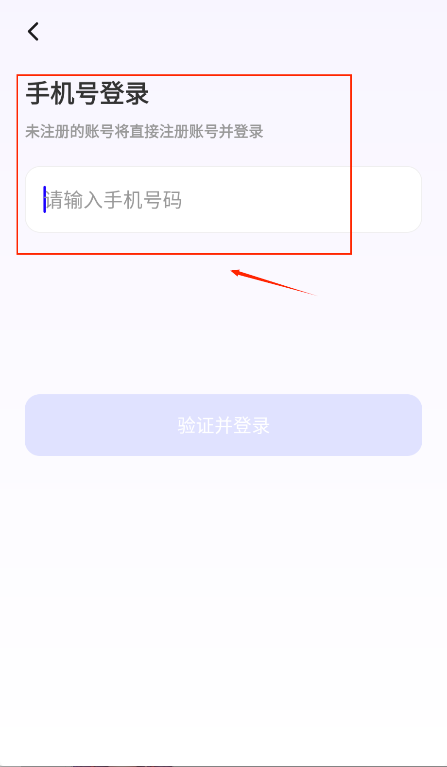 3、想用手机号快速登录的话,在"手机号登录"页面输入号码就行啦,没注册过的号码会自动完成注册,紫色"验证并登录"按钮点一下就能进入啦。