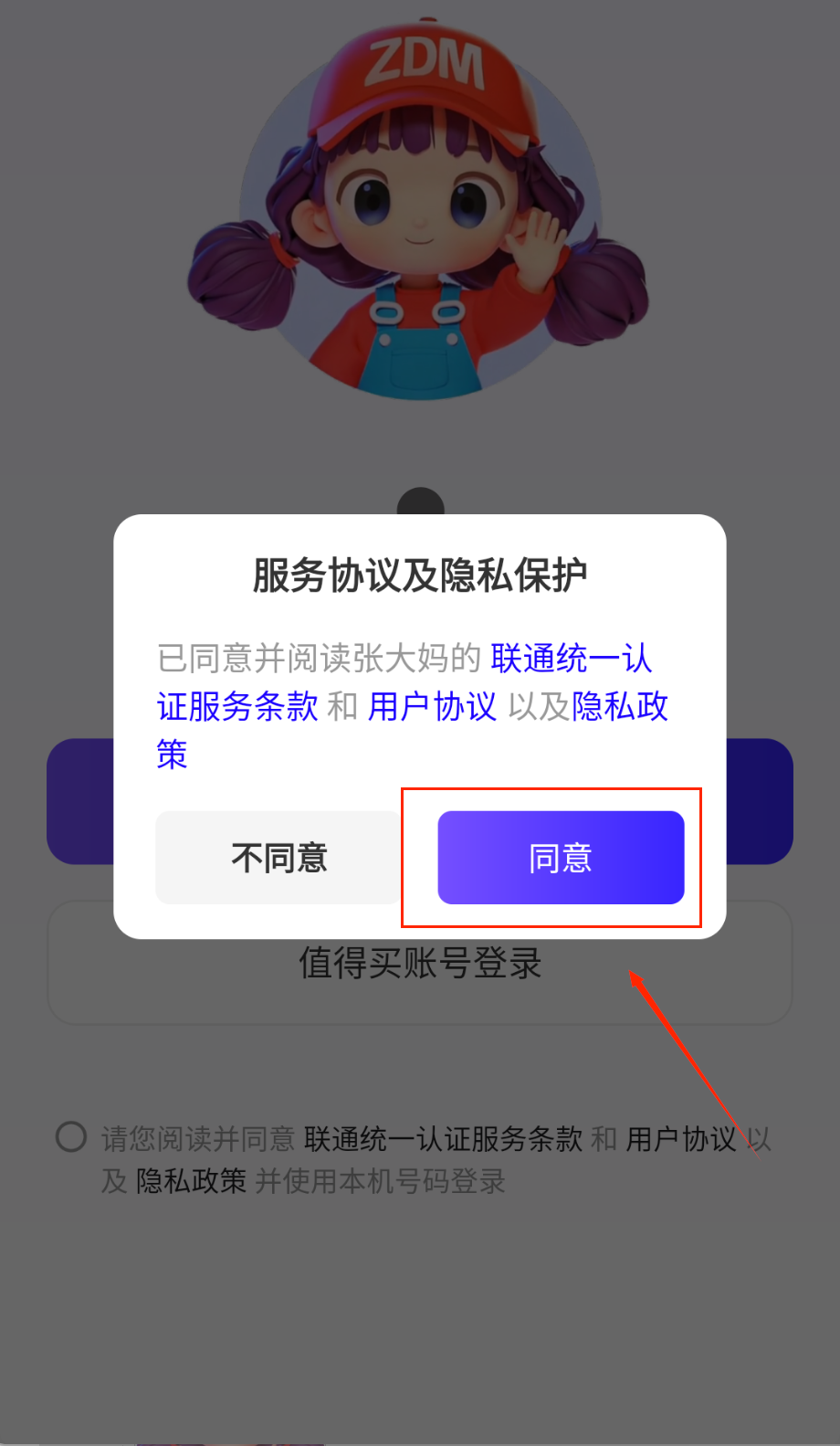 4、第一次登录时会弹出服务协议弹窗,记得仔细阅读条款内容呢,点"同意"才能继续使用,背景那个卡通头像还蛮可爱的对吧。
