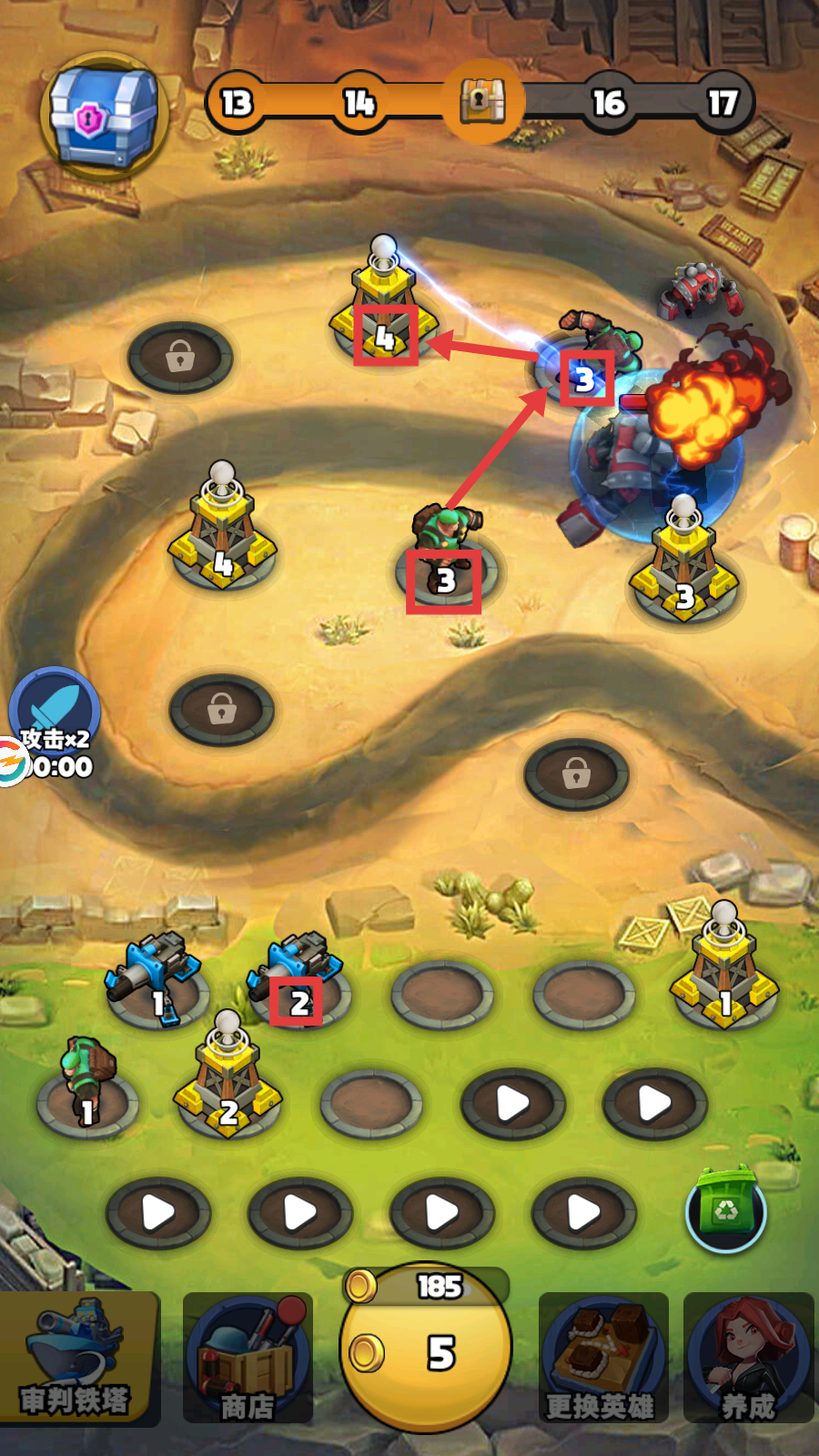 2、战斗时优先将相同【3级英雄】合并升级为【4级防御塔】,集中火力打击精英敌人,提升输出效率。