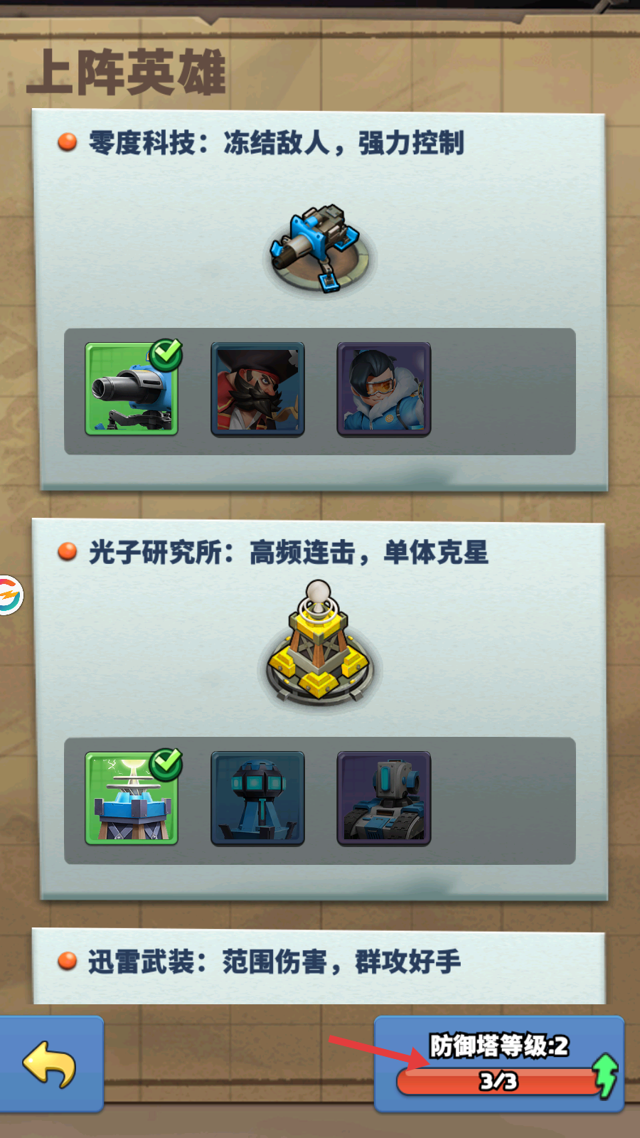 3、搭配阵容时,选【零度科技-冻结控制】与【光子研究所-高频连击】,互补功能构建攻防体系,提升防御塔等级。