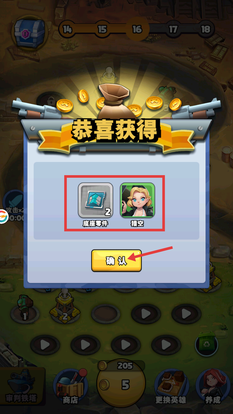 4、通关后及时领取【底座零件-2】与新英雄【猎空】,点击【确认】解锁养成资源,强化战力。