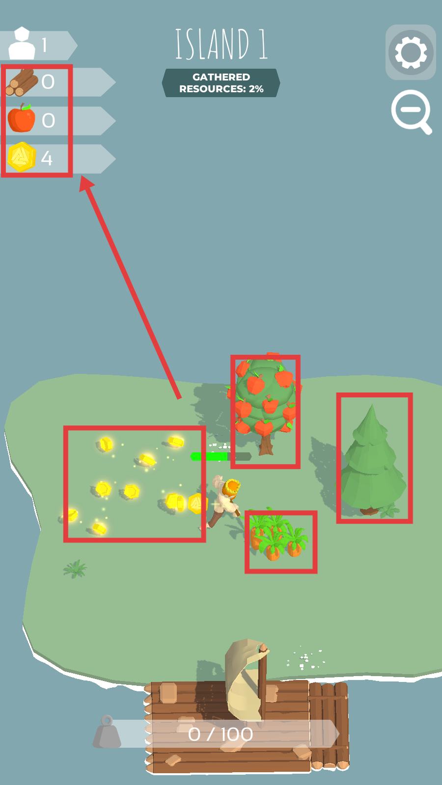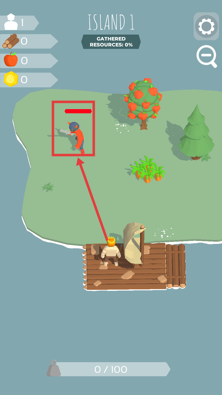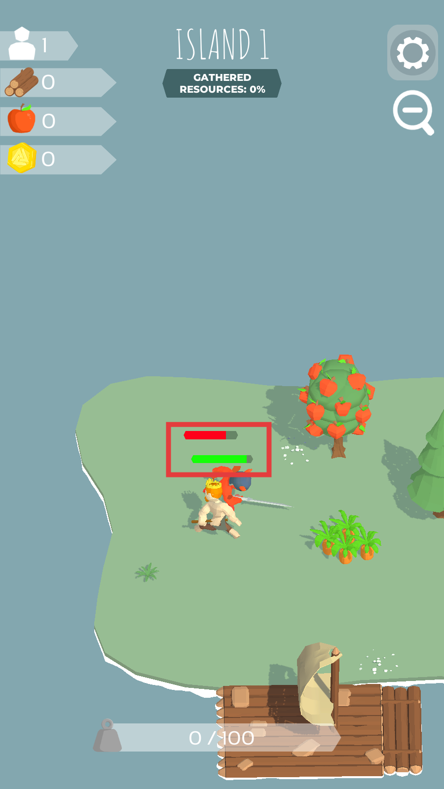 3、清理敌人后,采集【木材】【苹果】【金币】,砍伐树木、果树等获取资源,提升收集进度。