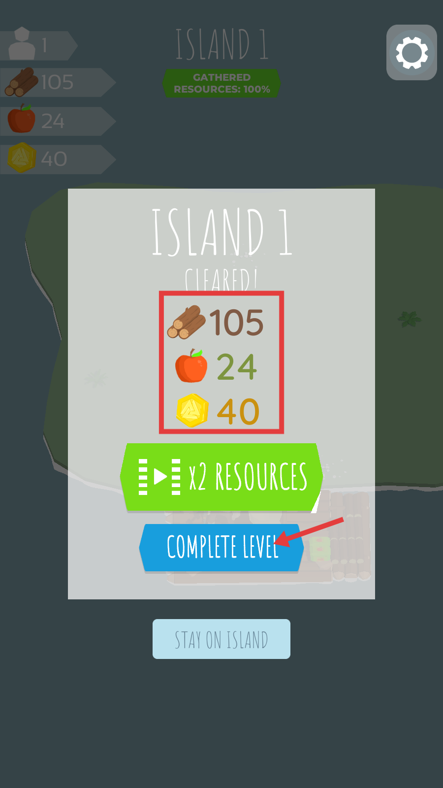 4、资源收集满100%,点击【COMPLETE-LEVEL】结算,领取【木材-105】【苹果-24】【金币-40】,推进关卡。
