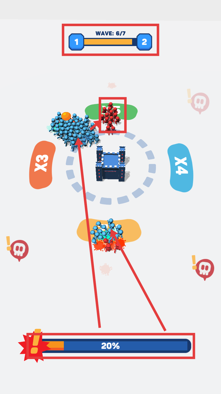 2、战斗时关注【WAVE-6/7】波数与进度条,指挥【蓝色士兵】【红色部队】拦截敌人,推进防御。