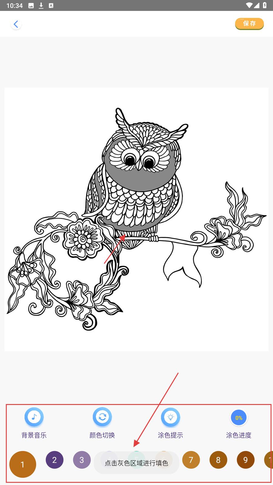 3、进入填色页面,在下方可以选择画笔颜色,按照提示在灰色区域填上对应颜色即可。