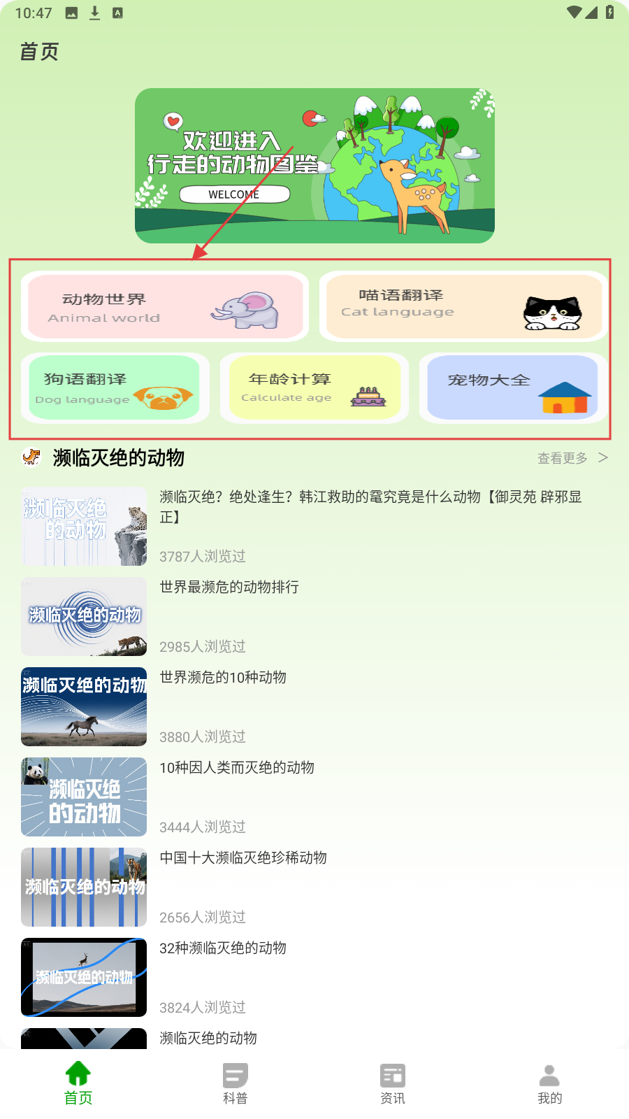 1、打开应用,在【首页】有动物世界、喵语翻译等功能按钮,按需选择,如点击【动物世界】。
