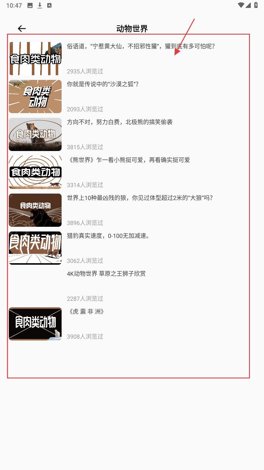 2、进入【动物世界】页面,选择感兴趣的文章点击进入。
