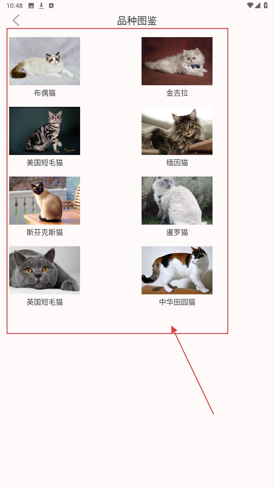 4、还可以点击进入【品种图鉴】页面,查看不同的猫的品种,加深对猫的了解。