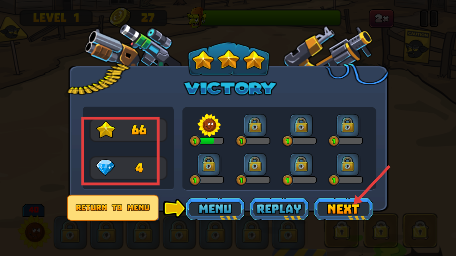 4、通关领取【星星-66】【钻石-4】,点击【NEXT】推进关卡,解锁新防御单位与挑战。