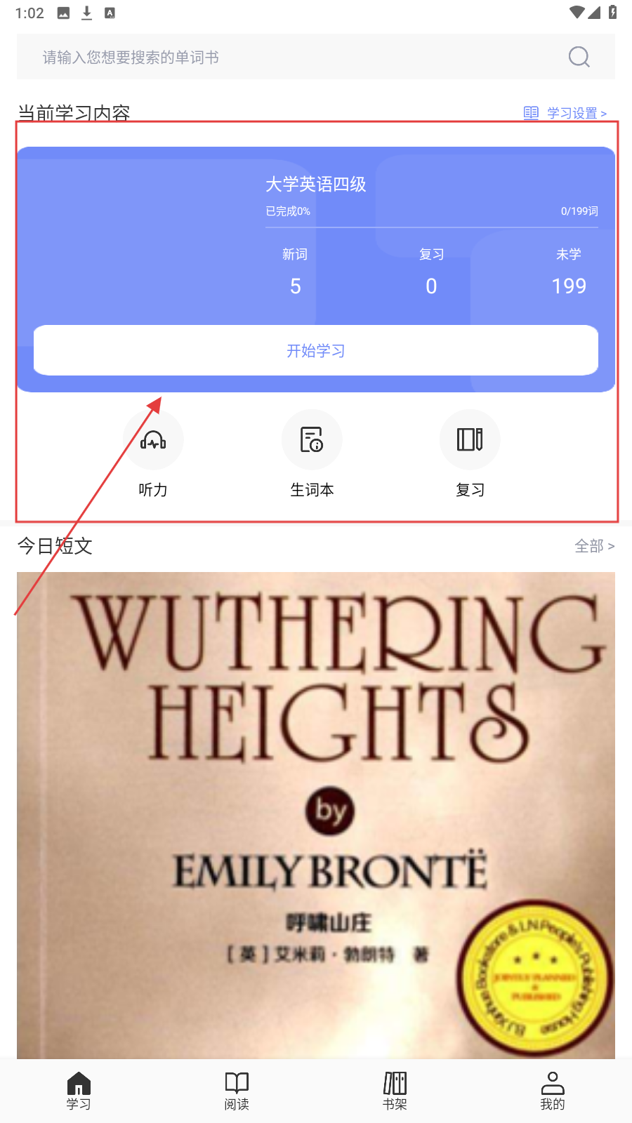 1、进入学习界面,选【大学英语四级】单词书,点击【开始学习】开启词汇积累。