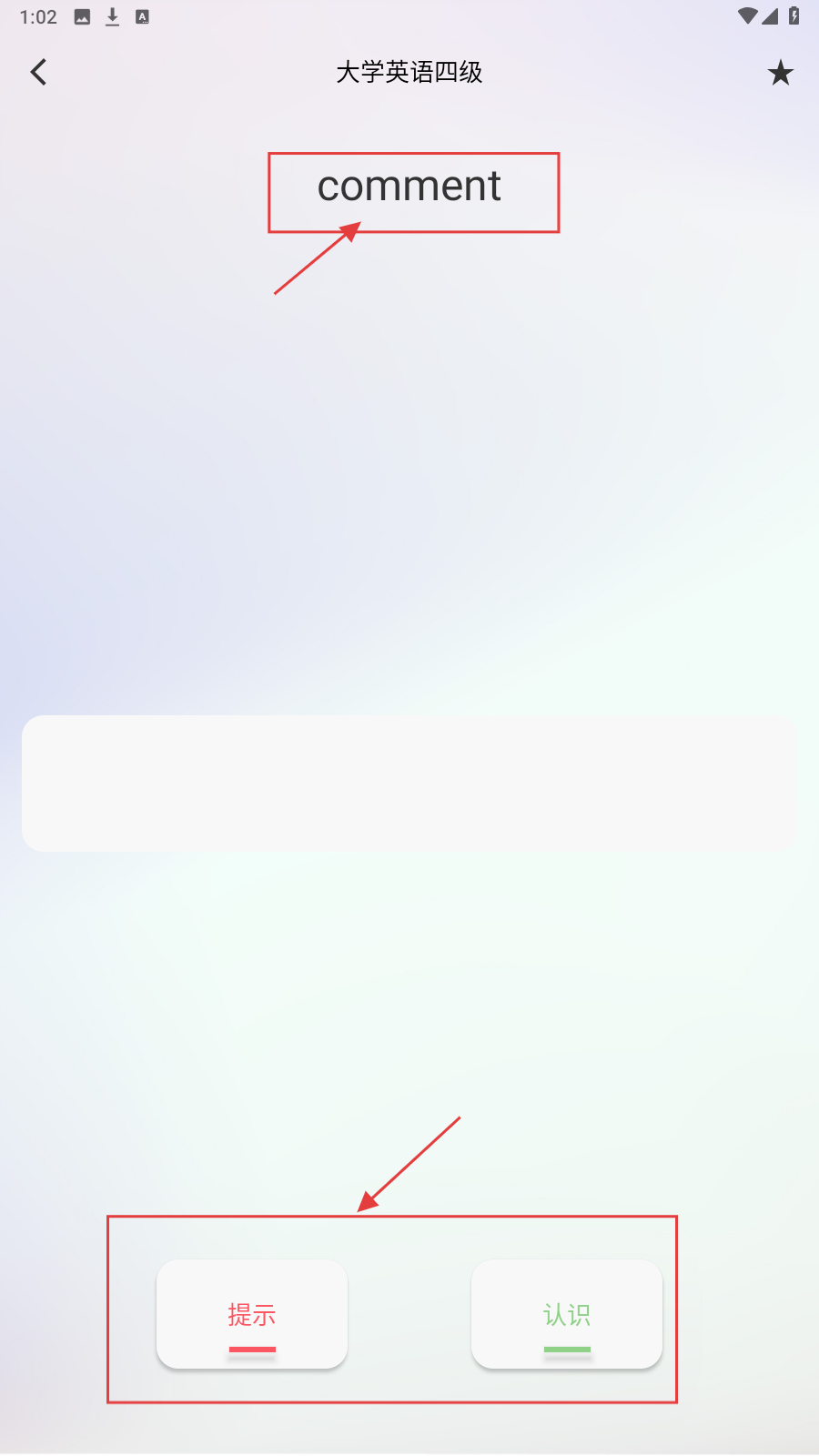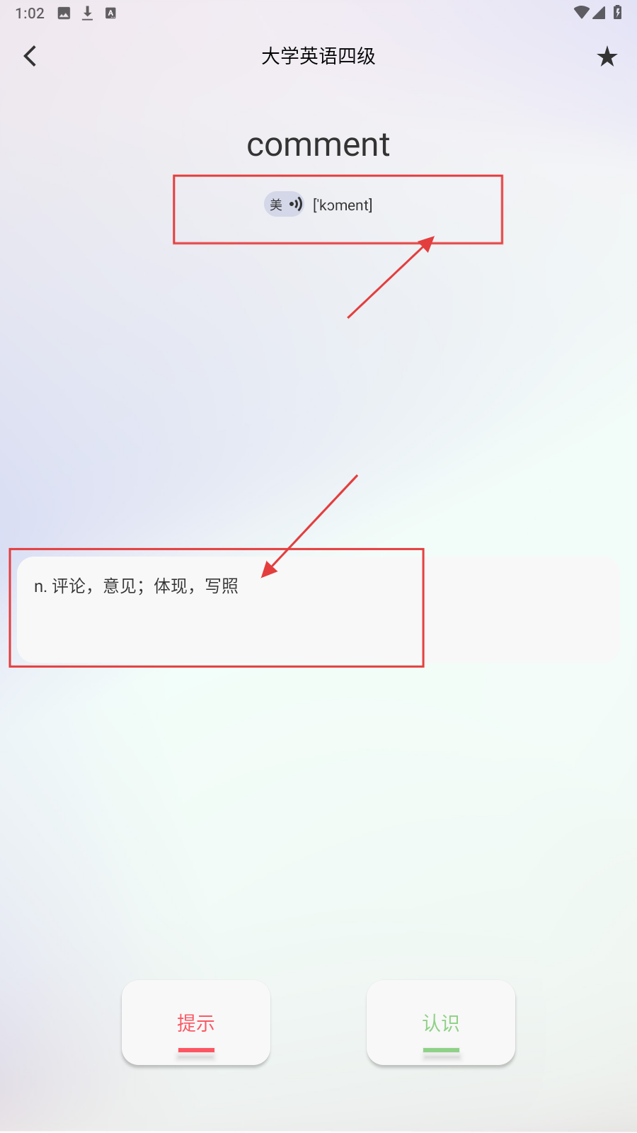 2、遇单词【comment】,若不认识,可点【提示】获辅助,认识则点【认识】标记掌握。