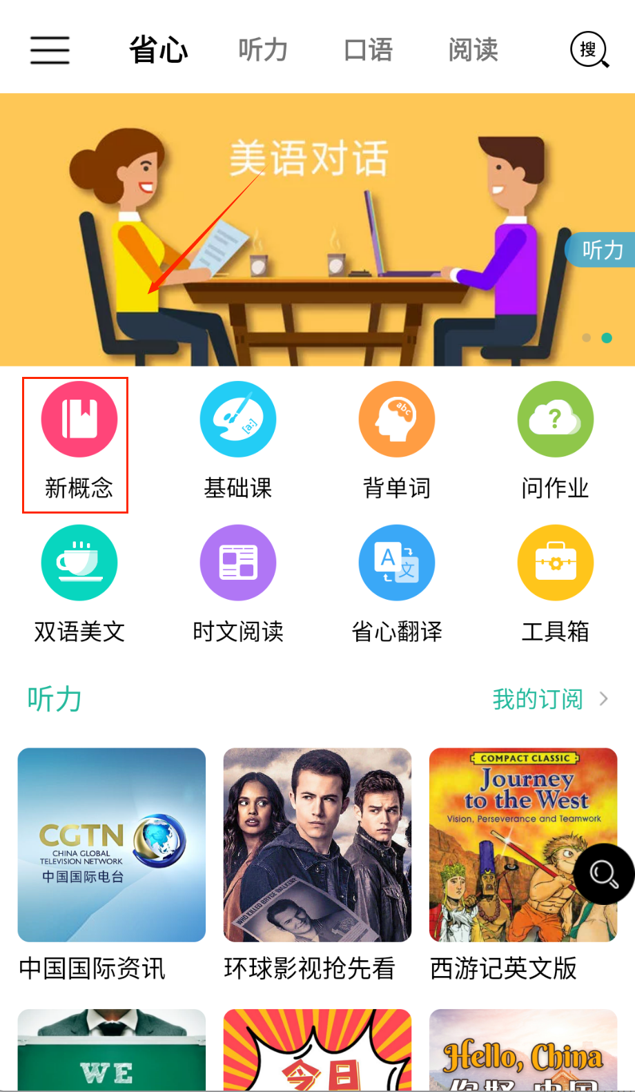 1、打开“学习”图标,进入后能看到“新概念英语”“基础课程”等不同模块,选择你感兴趣的课程点击进入。