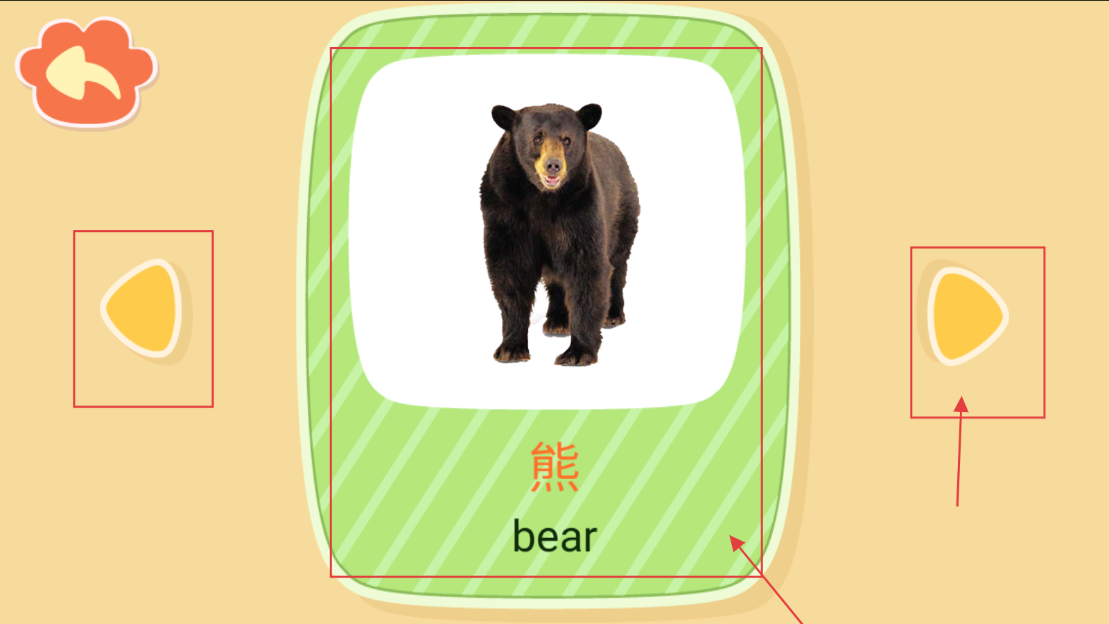 3、学动物时,看【熊-bear】卡片,记汉字与英文,借助左右按钮进行切换。