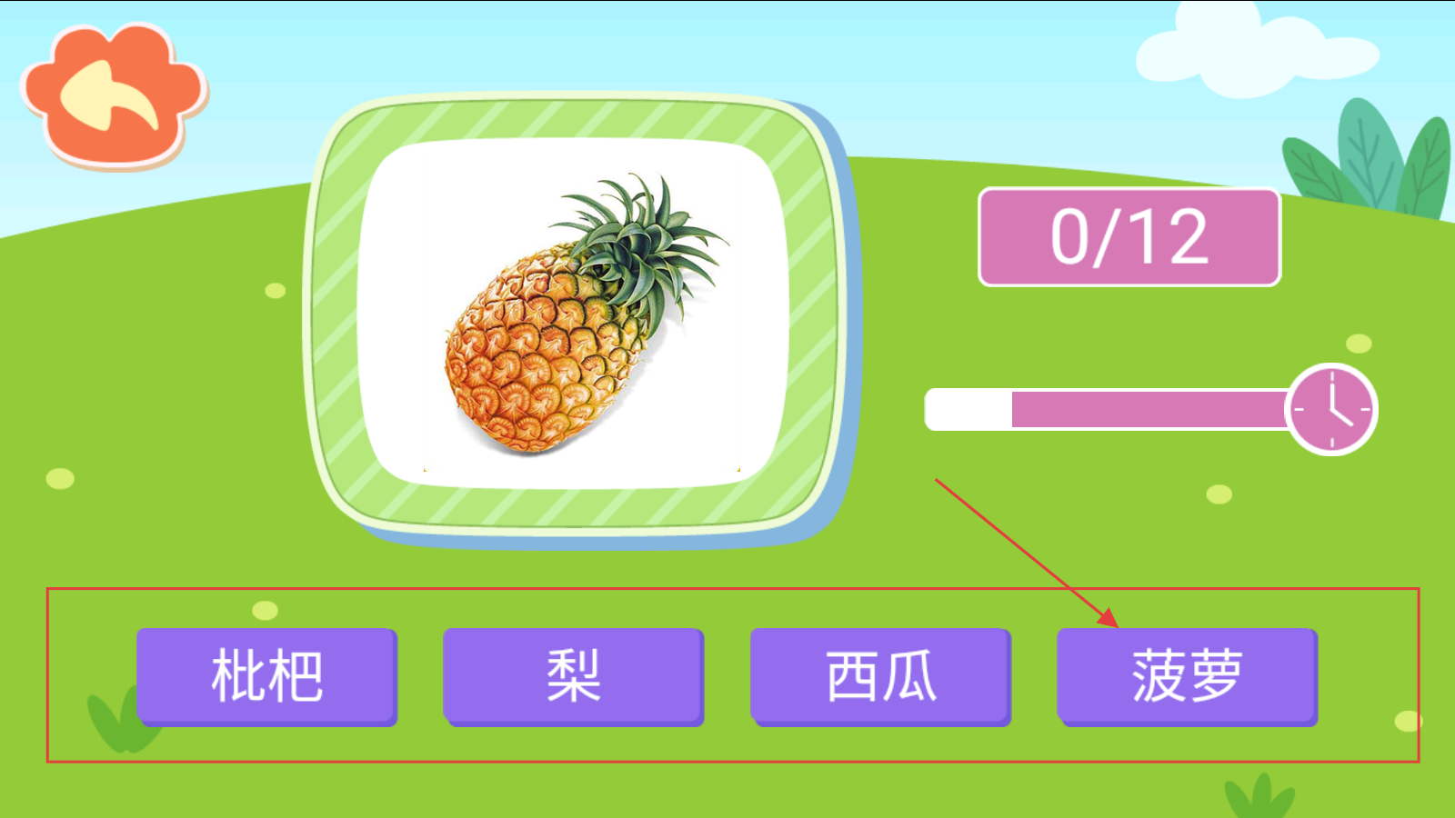 4、点击【比一比】,开始做题,识别菠萝图,选【菠萝】选项,完成认知答题挑战。
