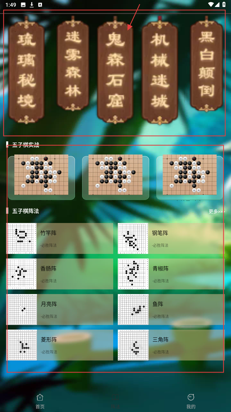4、切换到阵法界面,可选【鬼森石窟】等挑战,搭配五子棋阵法,实战试炼。