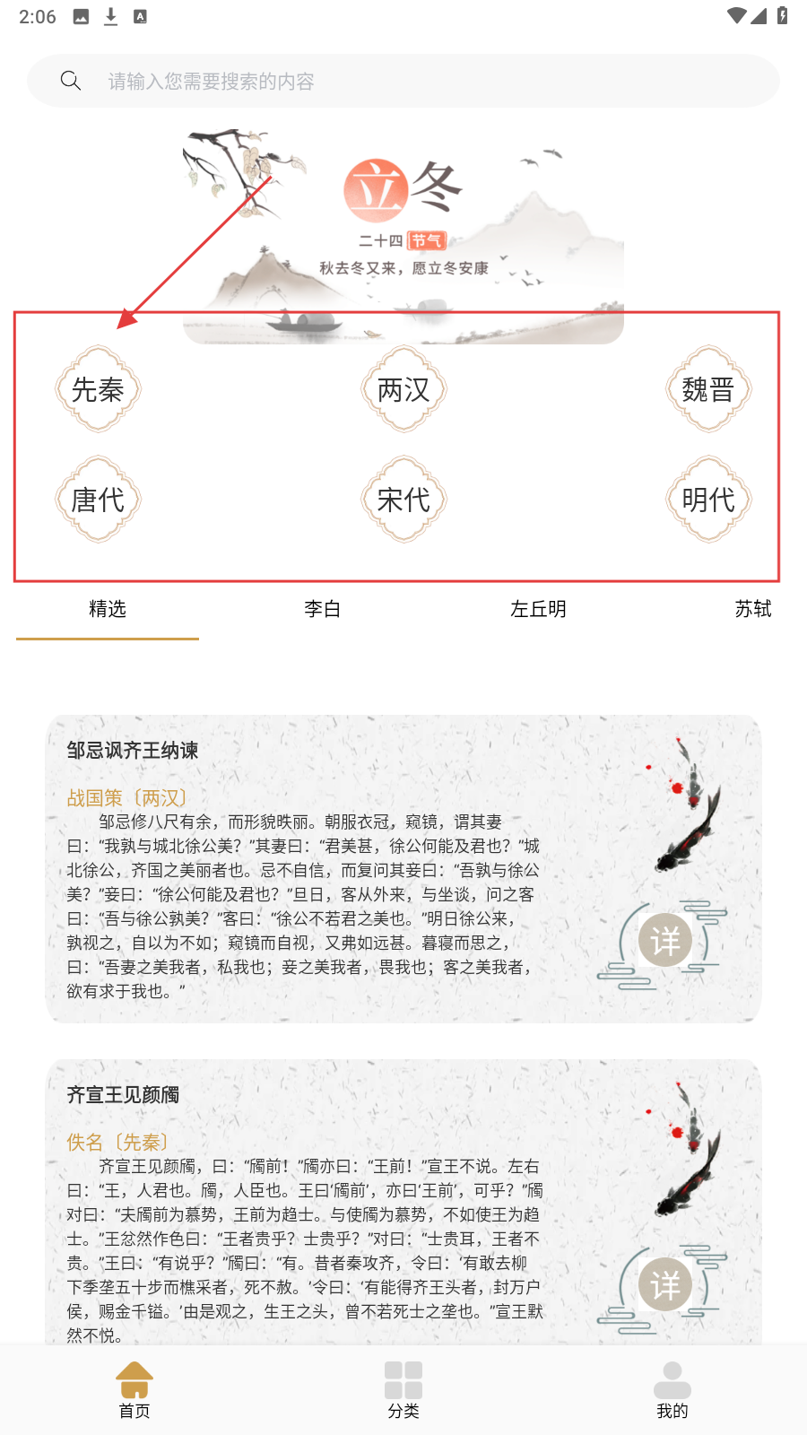1、进入首页,按需选【先秦】【两汉】等朝代,快速定位对应文言文内容浏览。