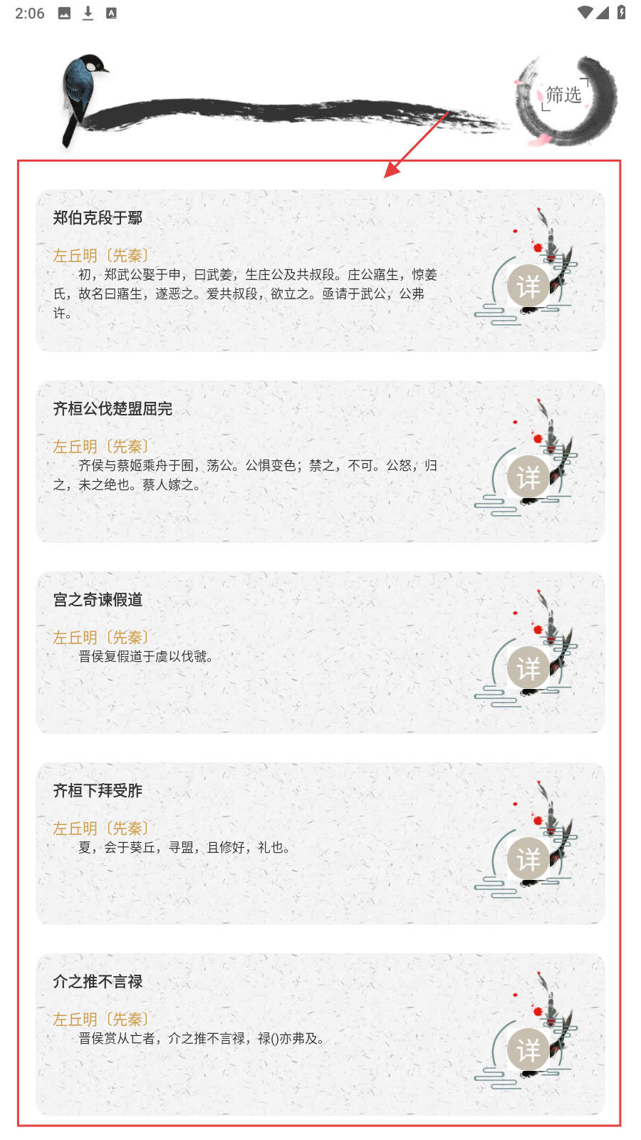 2、在朝代分类页,如先秦,浏览左丘明作品列表,点【详】深入了解文章详情。