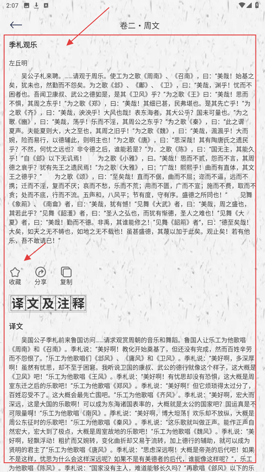 3、阅读文言文时,若喜欢【季札观乐】,点【收藏】留存,还可看译文注释辅助理解。