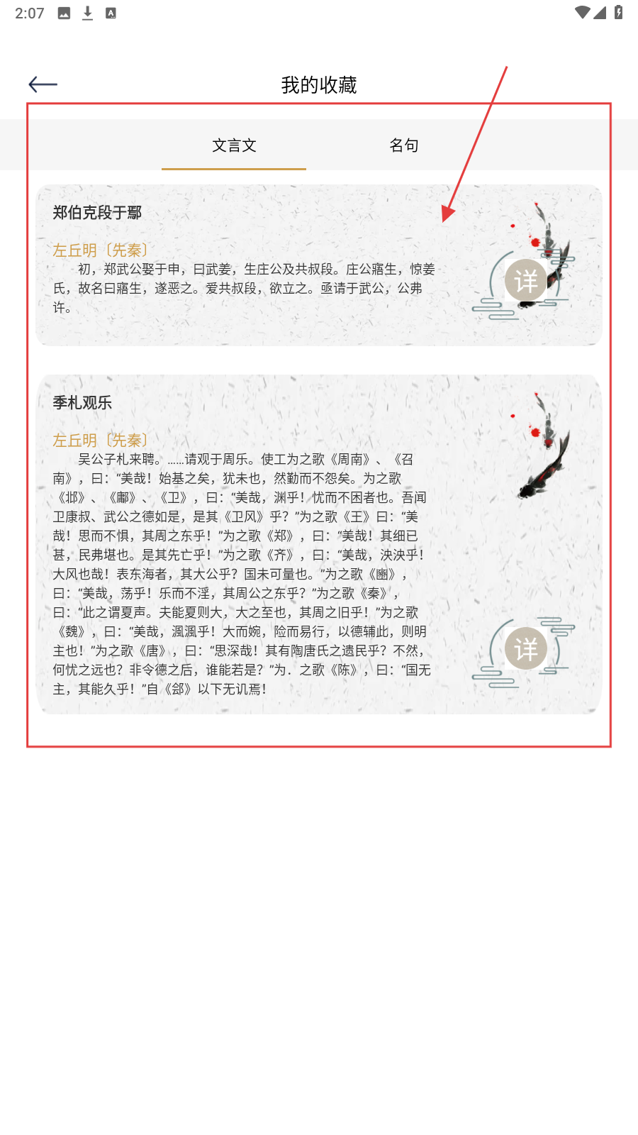 4、进入【我的收藏】,查看存的文言文,如【郑伯克段于鄢】【季札观乐】,随时回顾。
