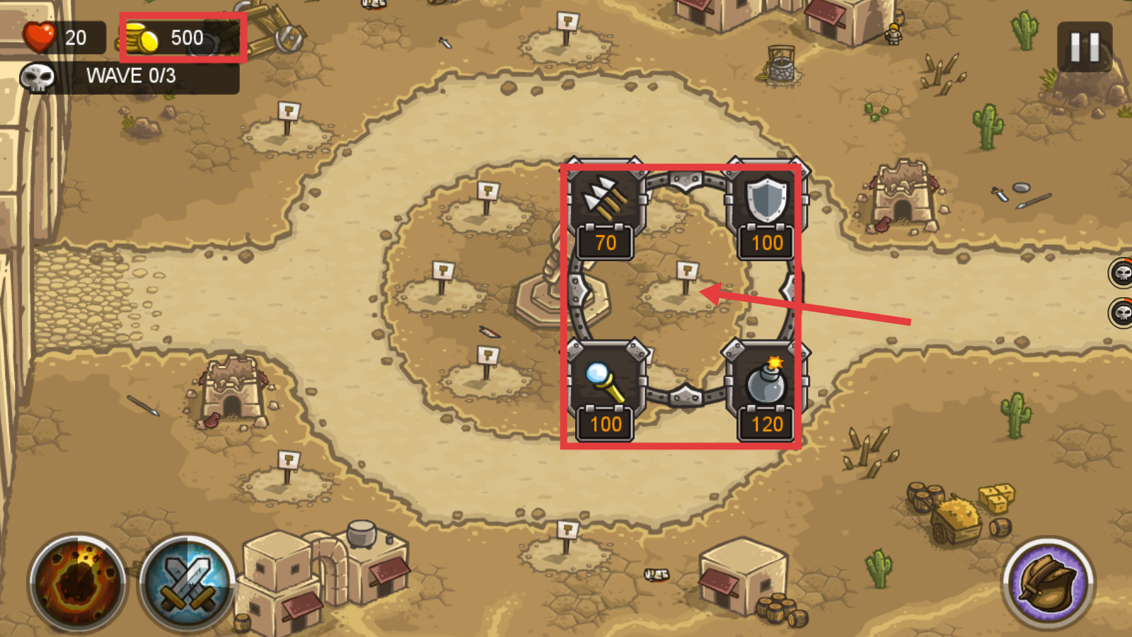 2、消耗初始【500-金币】,在核心区域搭建箭塔、护盾塔等防御建筑,构建环形防御体系。