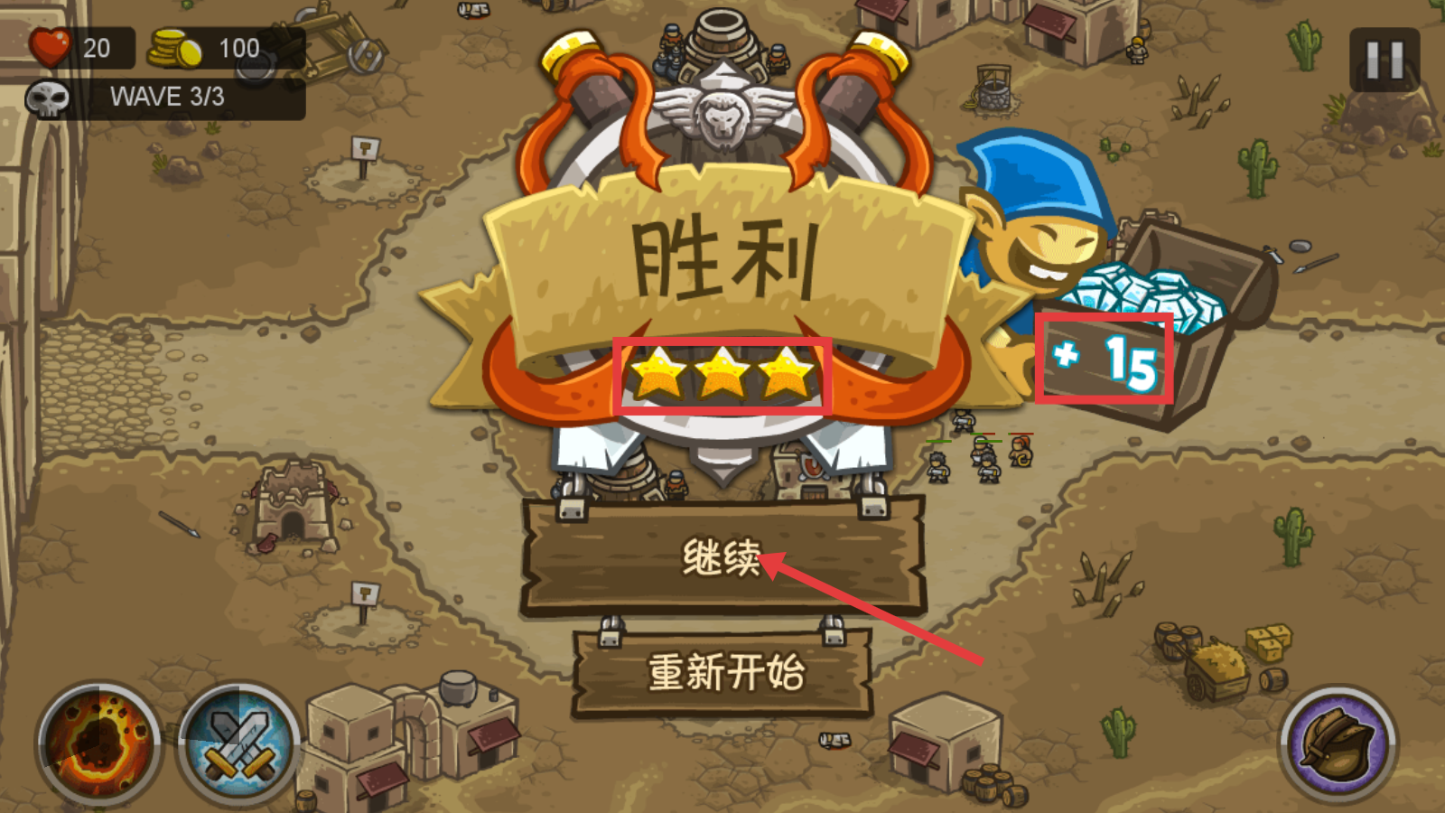4、通关获【三星】评价与【+15】钻石,点击【继续】结算奖励,筹备后续关卡防御。