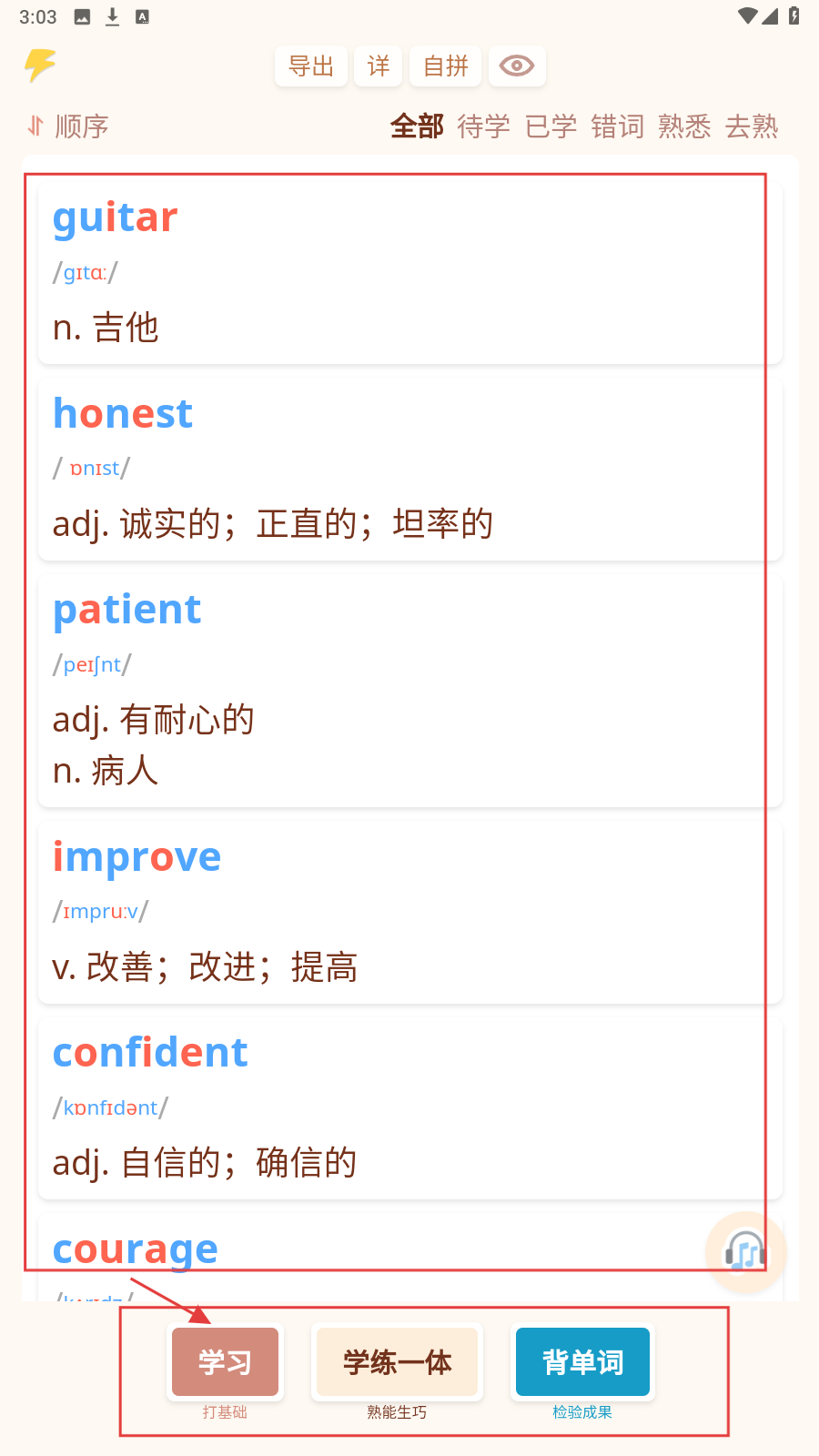 2、在单词列表页,选【学习】模式,逐个攻克【guitar】【honest】等单词基础释义。