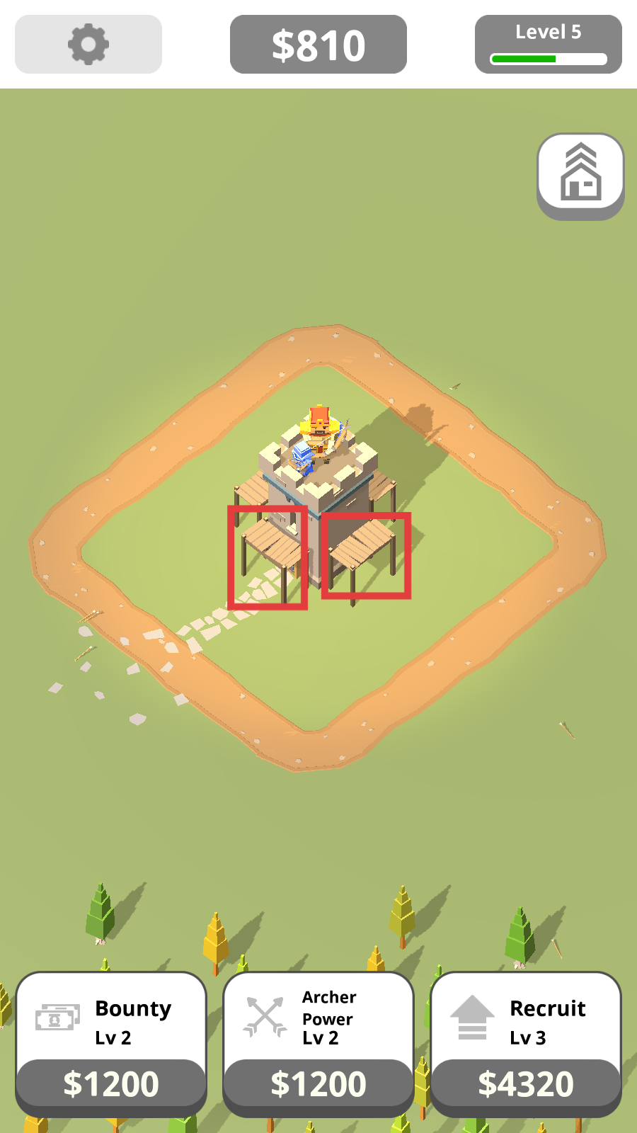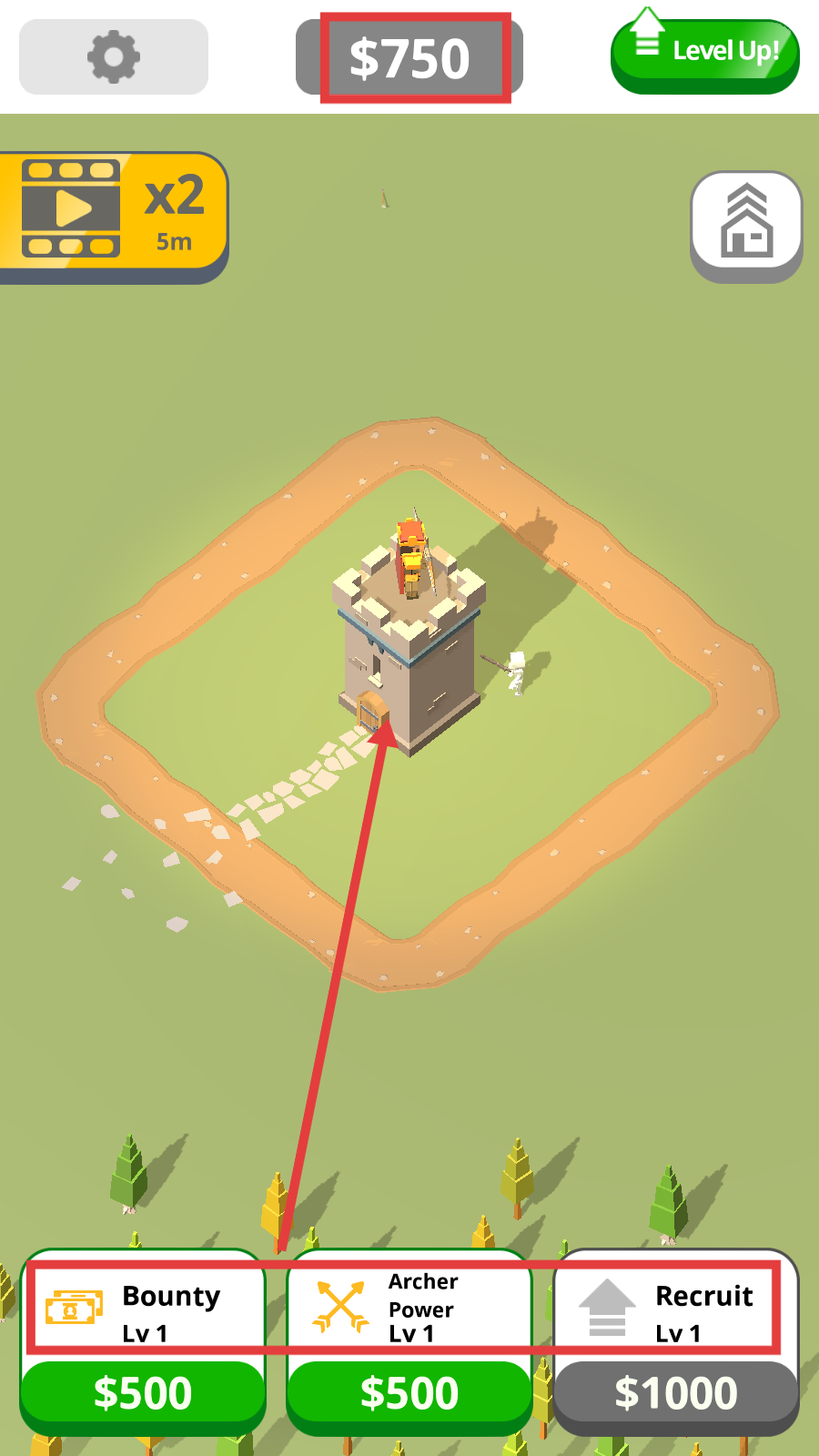 1、初始有【$750】,选择底部【Bounty】【ArcherPower】【Recruit】任一升级,启动防御体系搭建。