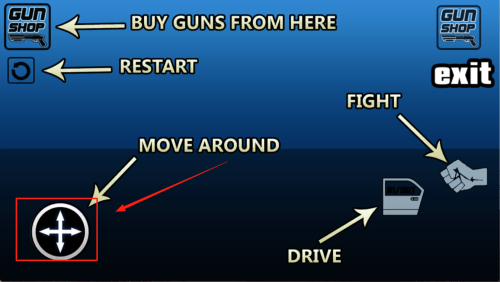 1、浏览主菜单:看到“GUN、SHOP、FIGHT、DRIVE”等按钮后,先点“SHOP”买把基础武器,再点“DRIVE”熟悉移动。