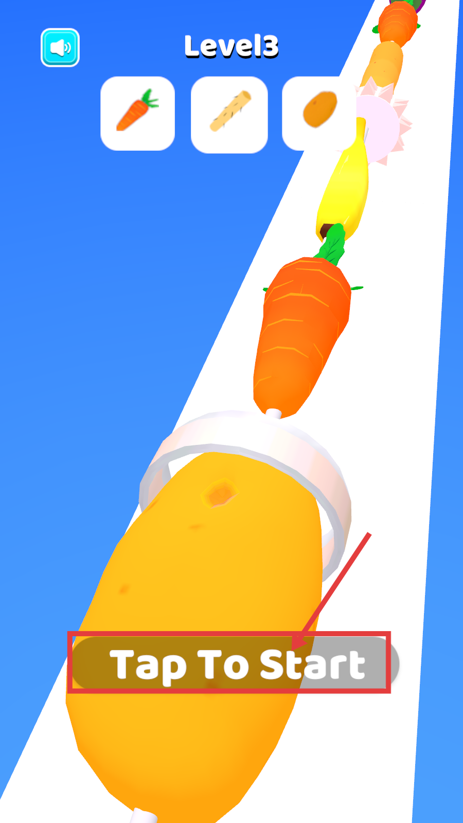 1、Level3开局,点击【Tap-To-Start】启动,让蔬菜进入轨道,开启削皮加工挑战。