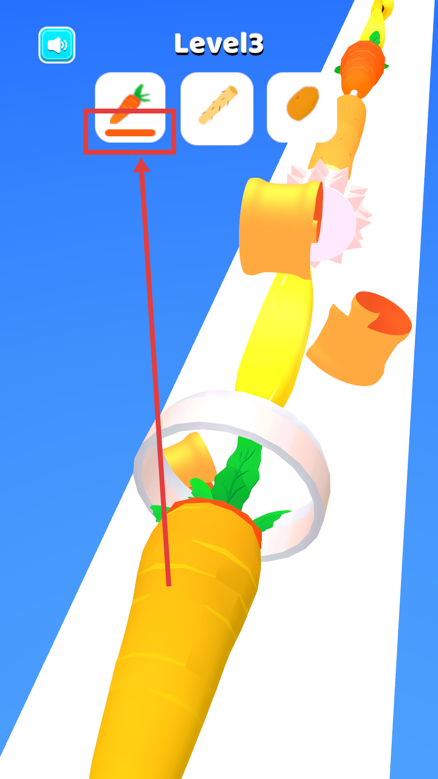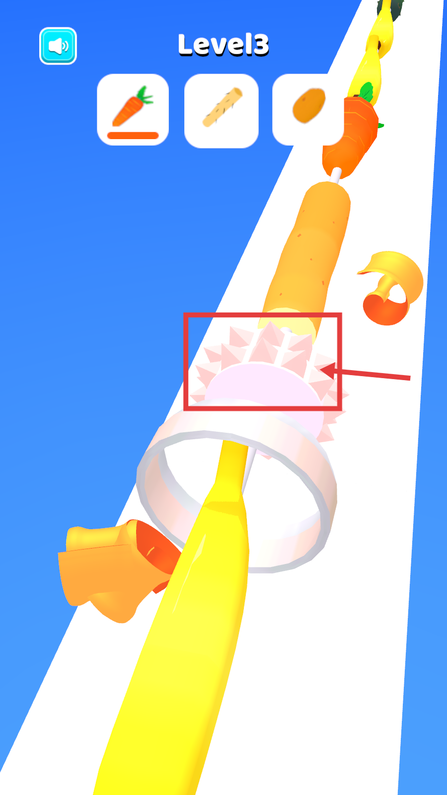 2、锁定顶部【胡萝卜】目标,操纵圆环慢慢缩小,为胡萝卜削掉外皮,推进进度条完成任务。