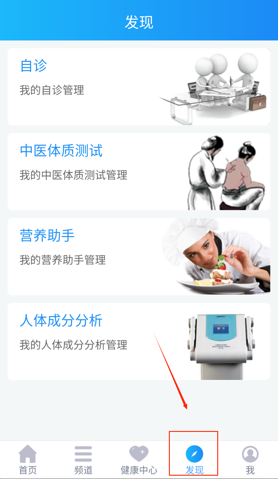 2、通过发现模块进行健康自测和体质评估,系统会根据测试结果给出初步的健康建议,帮助用户了解自身健康状况。