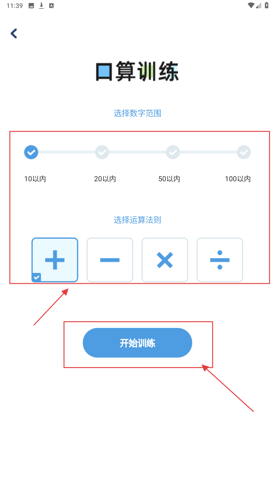 4、切换至【口算训练】页面,选数字范围(如10以内)、运算法则(加法),点【开始训练】。