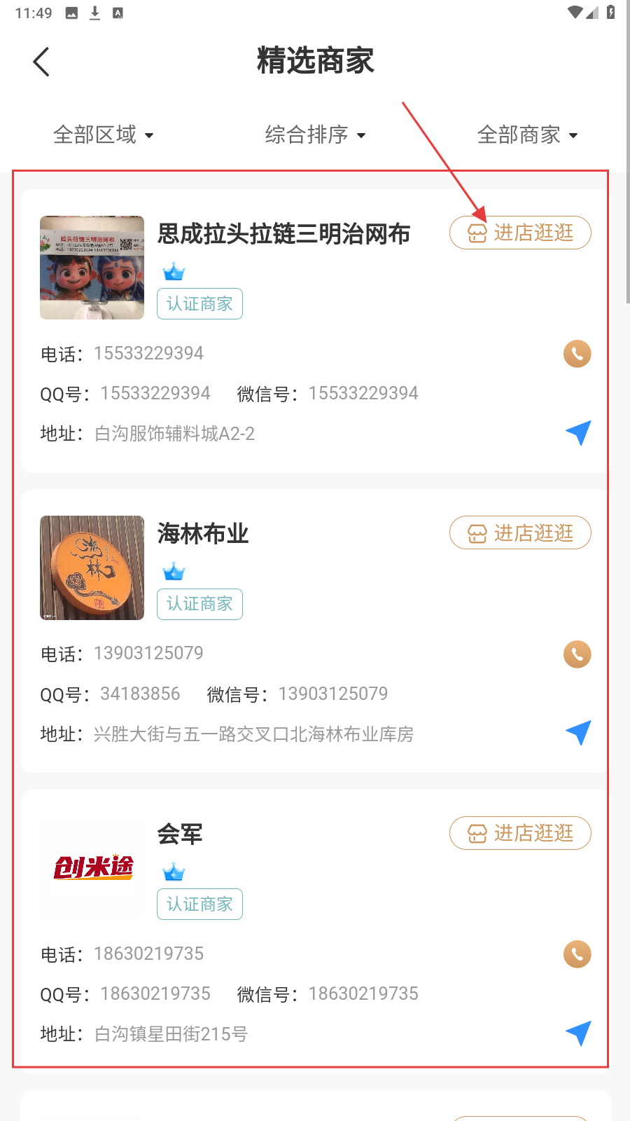 2、在精选商家页,选感兴趣的商家,点击【进店逛逛】,进入商家店铺。