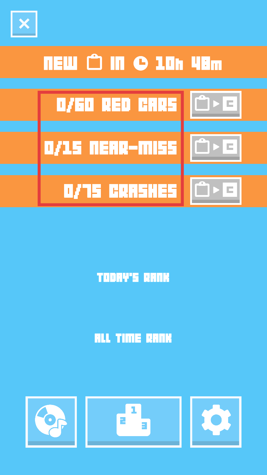 2、查看任务面板,明确【0/60-RED-CARS】【0/15-NEAR-MISS】【0/75-CRASHES】的达成条件,规划游戏策略。