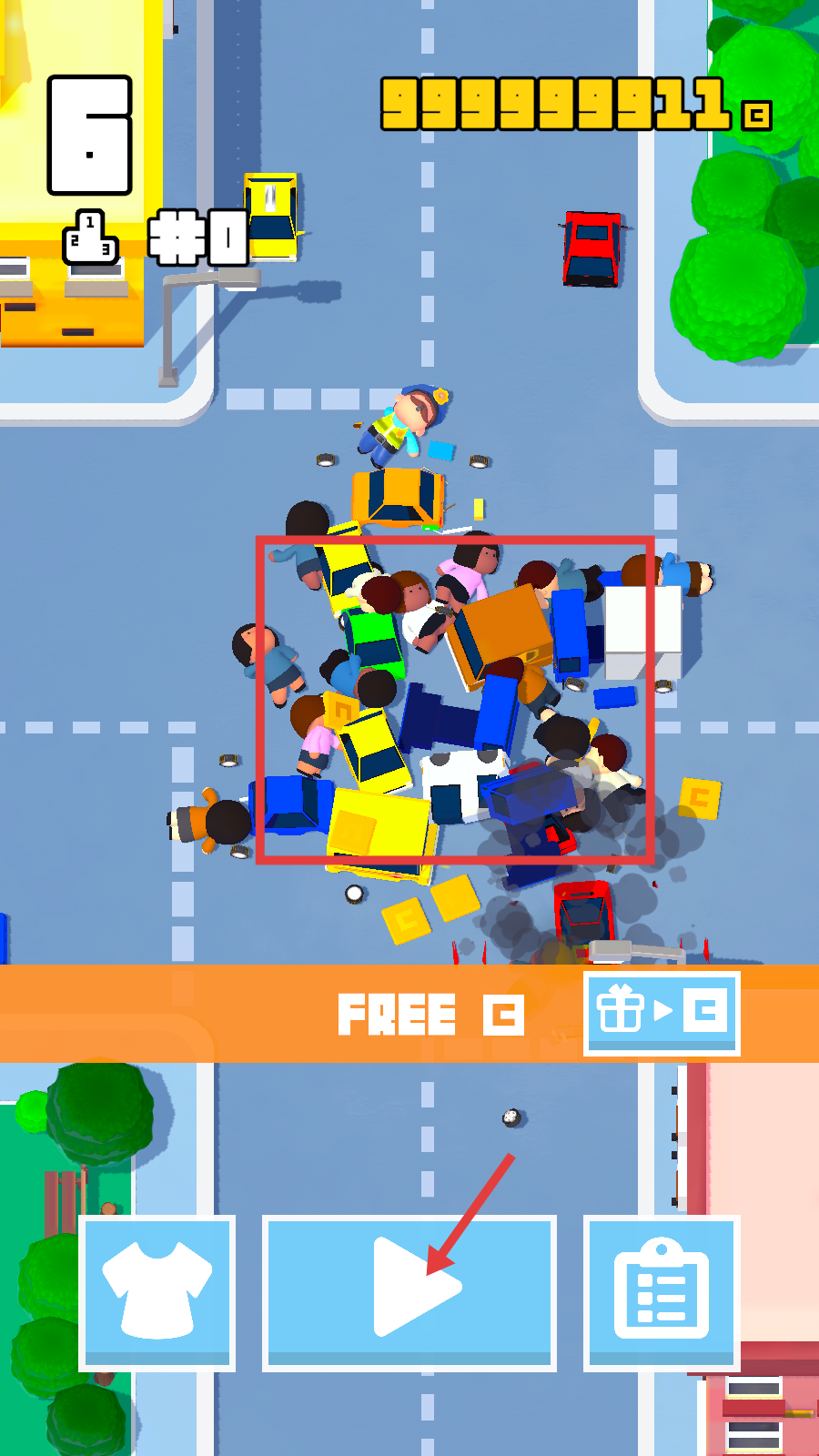 4、利用车辆碰撞堆积场景,统计事故数完成【0/75-CRASHES】任务,点击播放键继续流程。