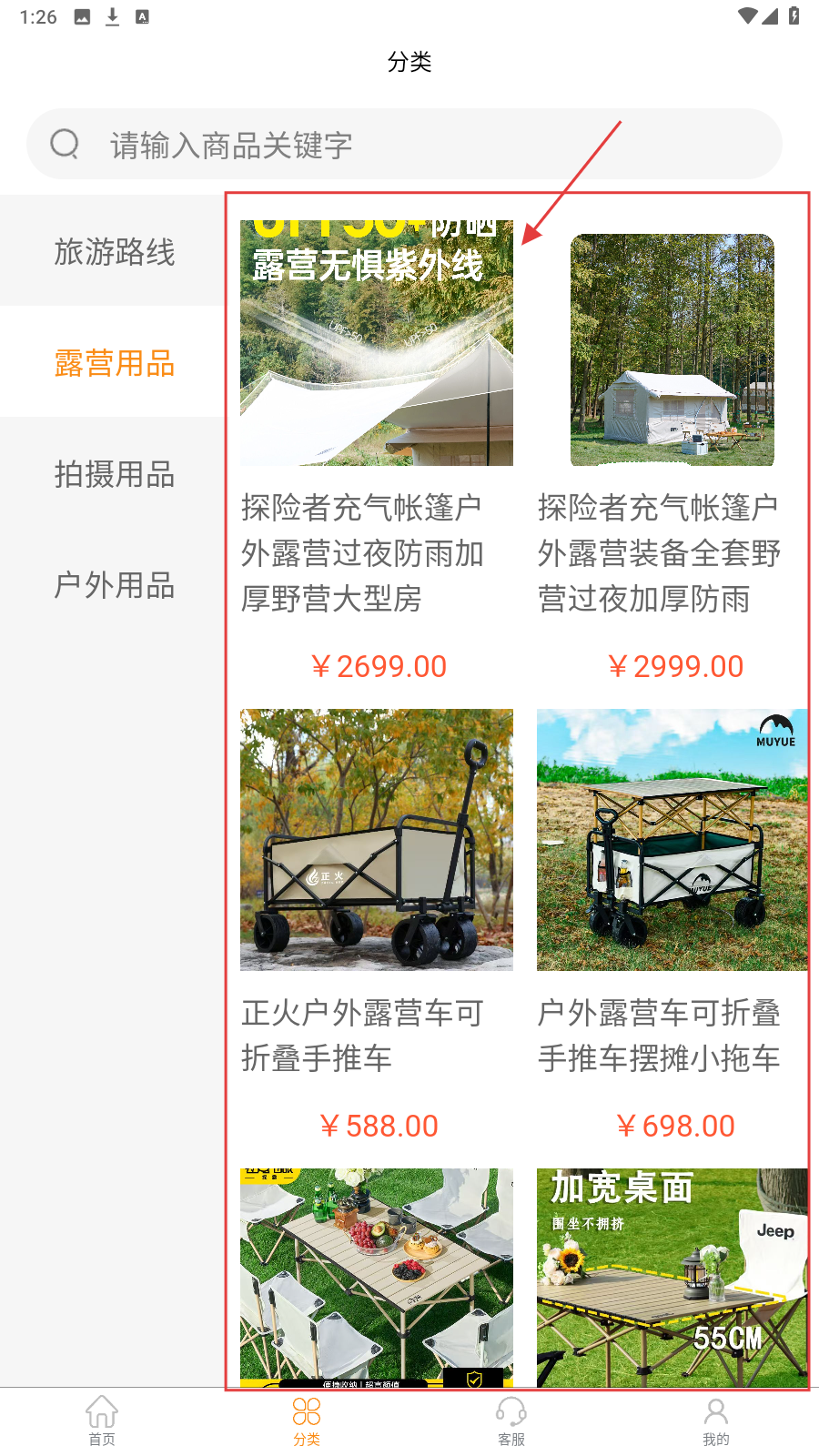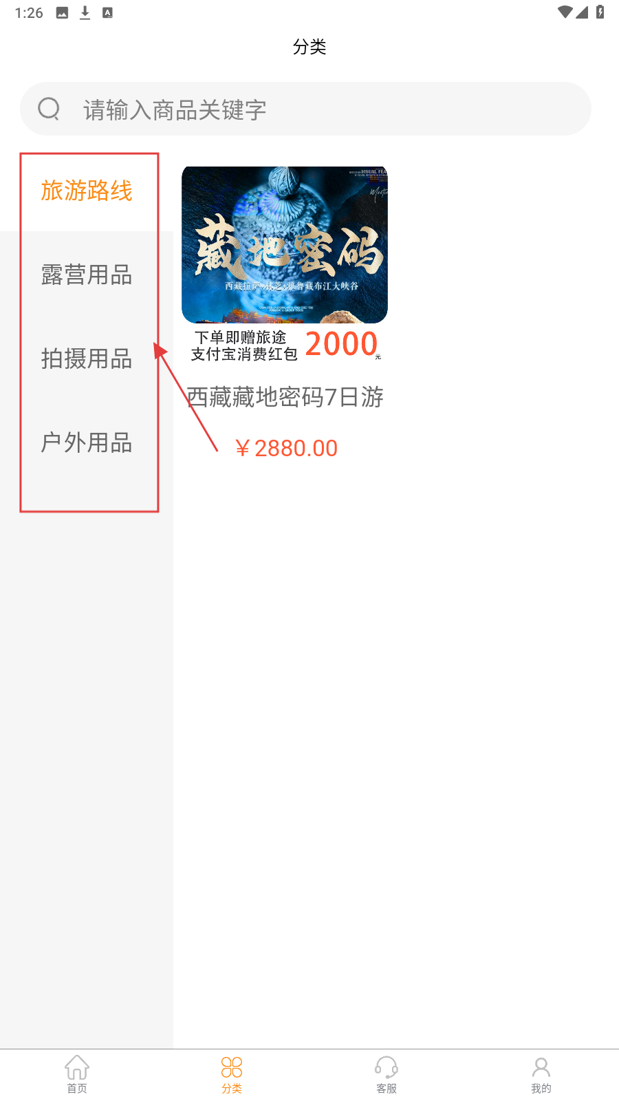 1、进入【分类】页,选【旅游路线】【露营用品】等分类,精准找户外商品。