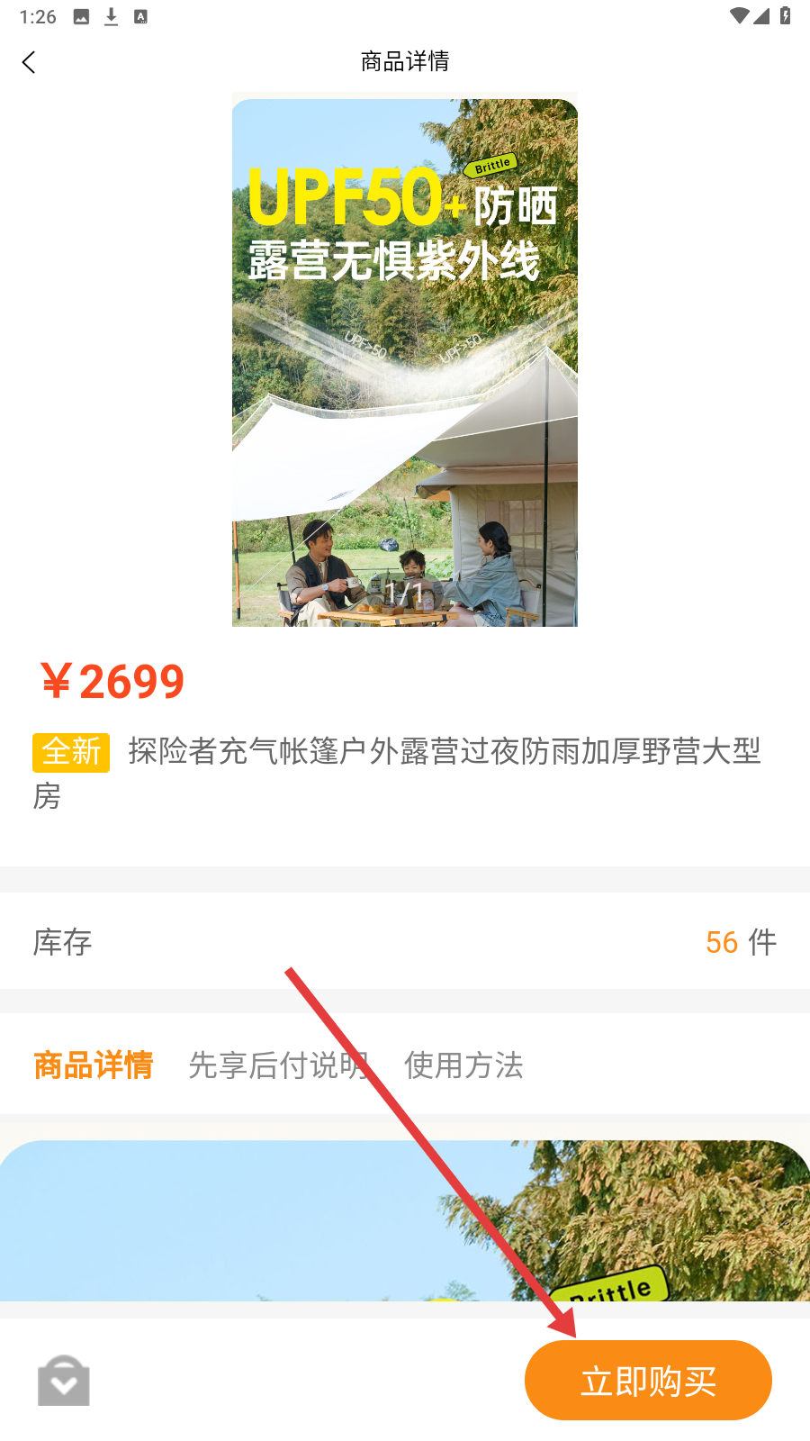 3、进入商品详情页,查看探险者帐篷价格、库存,了解商品信息。