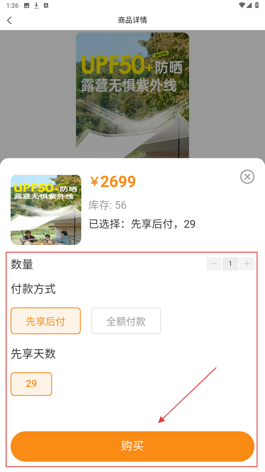4、选数量、付款方式,确认先享天数后点【购买】,完成下单流程。