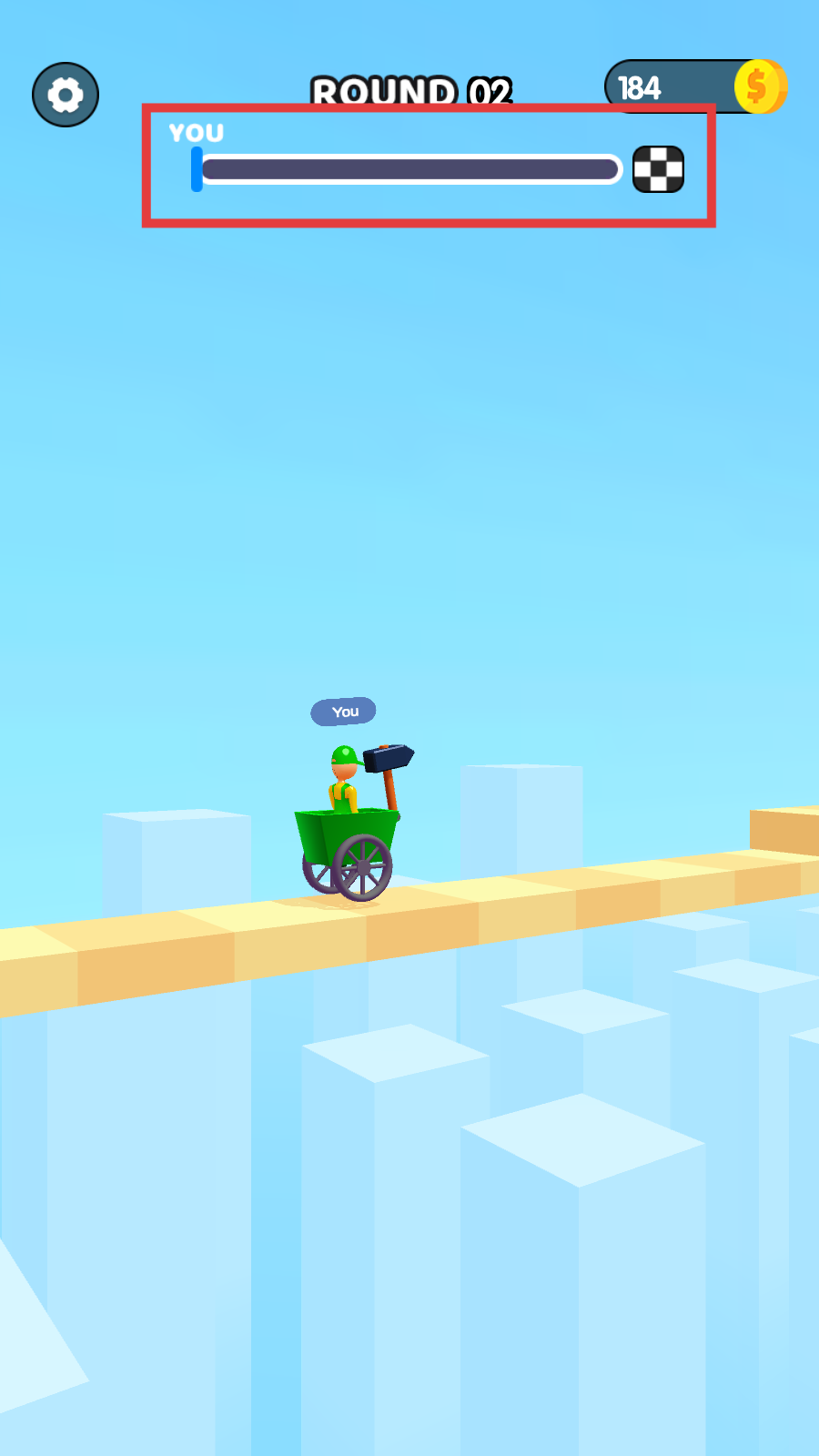 1、进入【ROUND-02】,紧盯【YOU】进度条,操控推车朝终点格稳步起步,明确赛程目标。