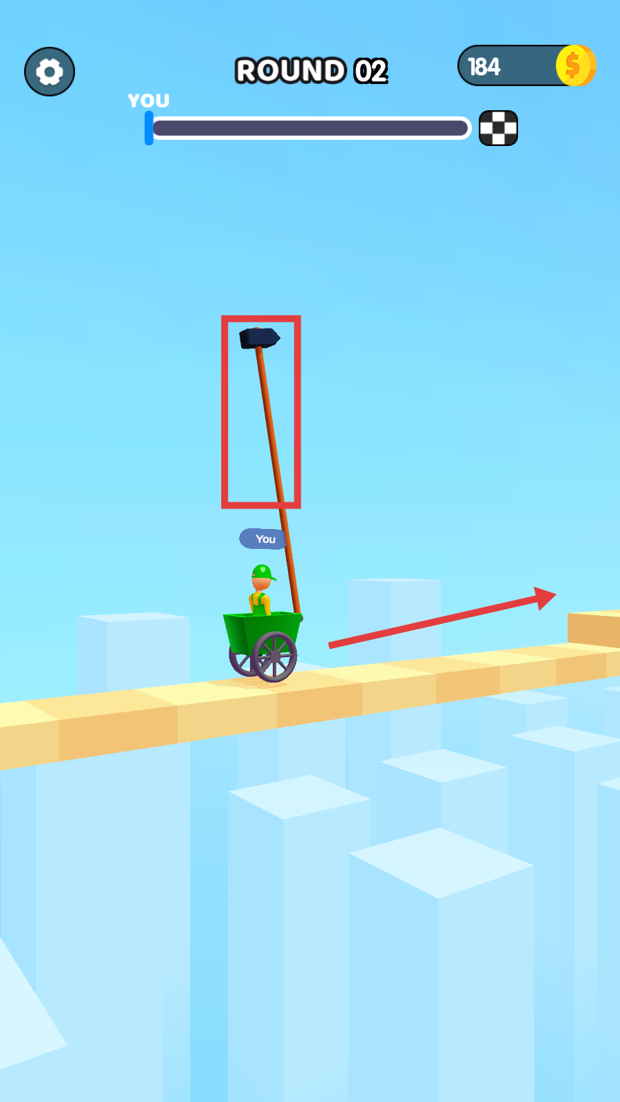 2、握住【长柄锤子】,敲击地面借力,让推车沿箭头方向跨越间隙,把控敲击节奏前行。
