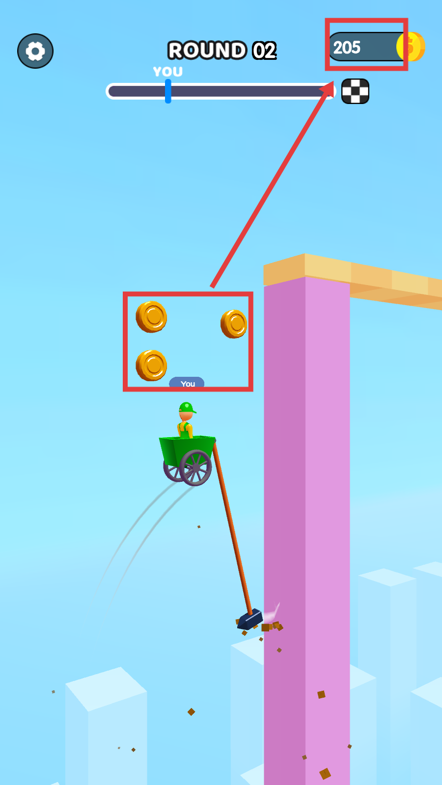 3、途经金币区优先拾取,再用锤子砸断粉色柱,助力进度条冲向终点,资源障碍双突破。