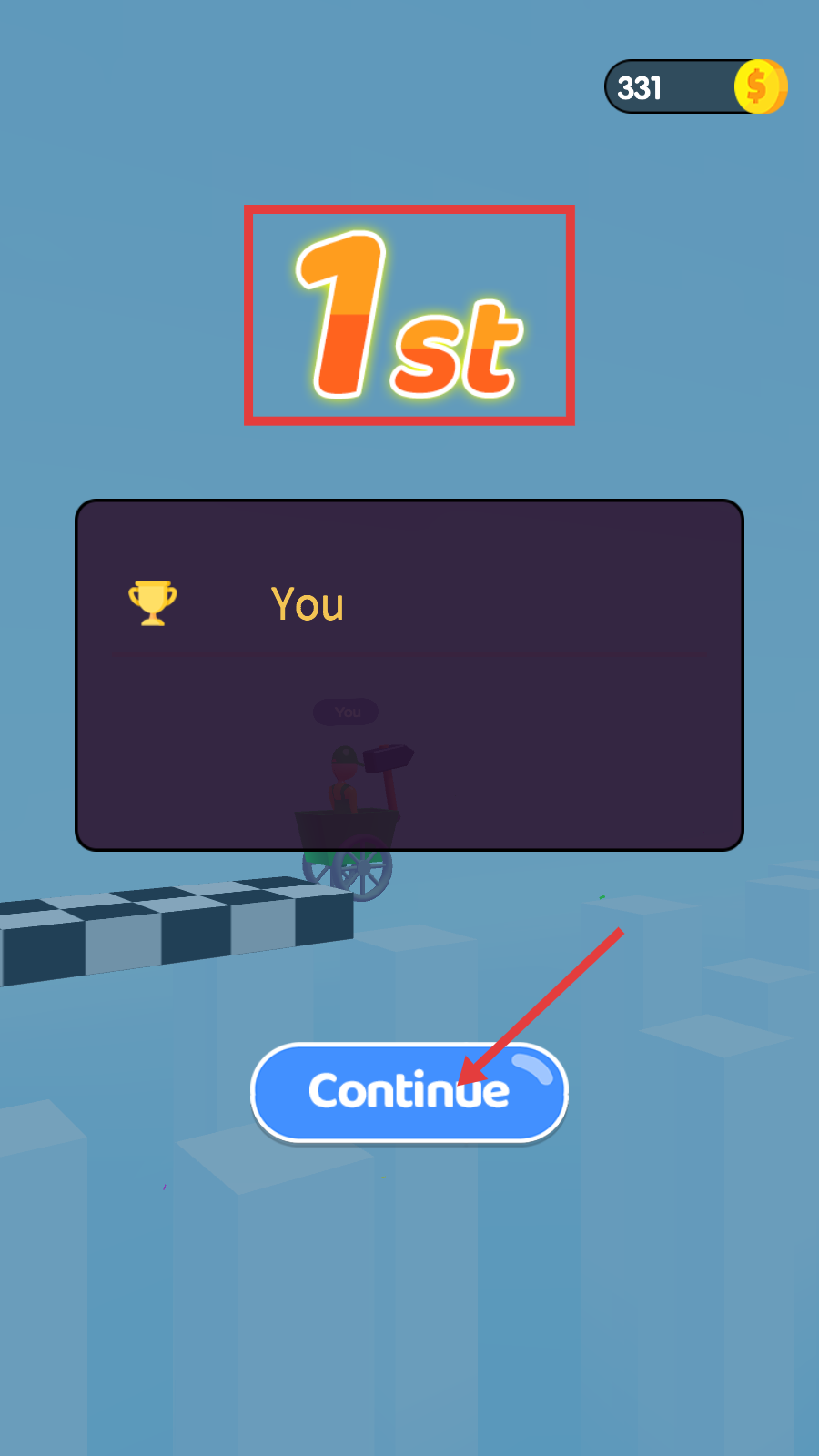 4、冲过终点获【1st】排名,点击【Continue】按钮,开启下一轮挑战,积累金币升级。