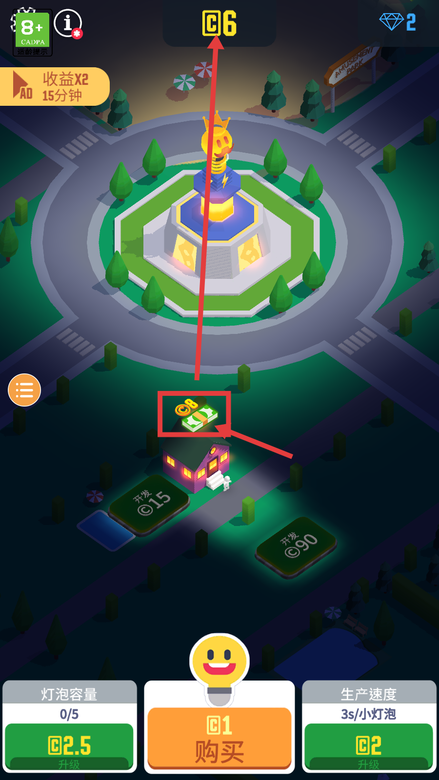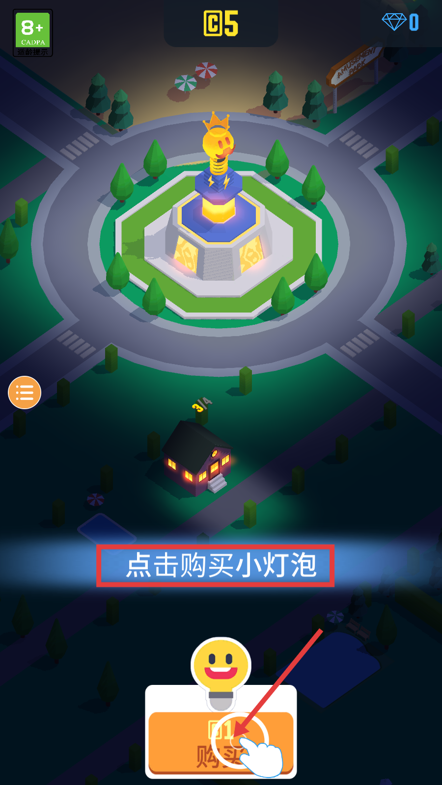 1、进入界面后,点击底部【购买】按钮获取小灯泡,依托中央建筑开启资源积累。