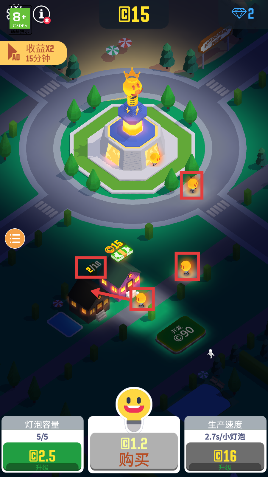 3、强力角色召唤:特殊时刻启用灯泡国王能力,瞬间填充大片区域建筑加快核心街区亮化工程完成进度。
