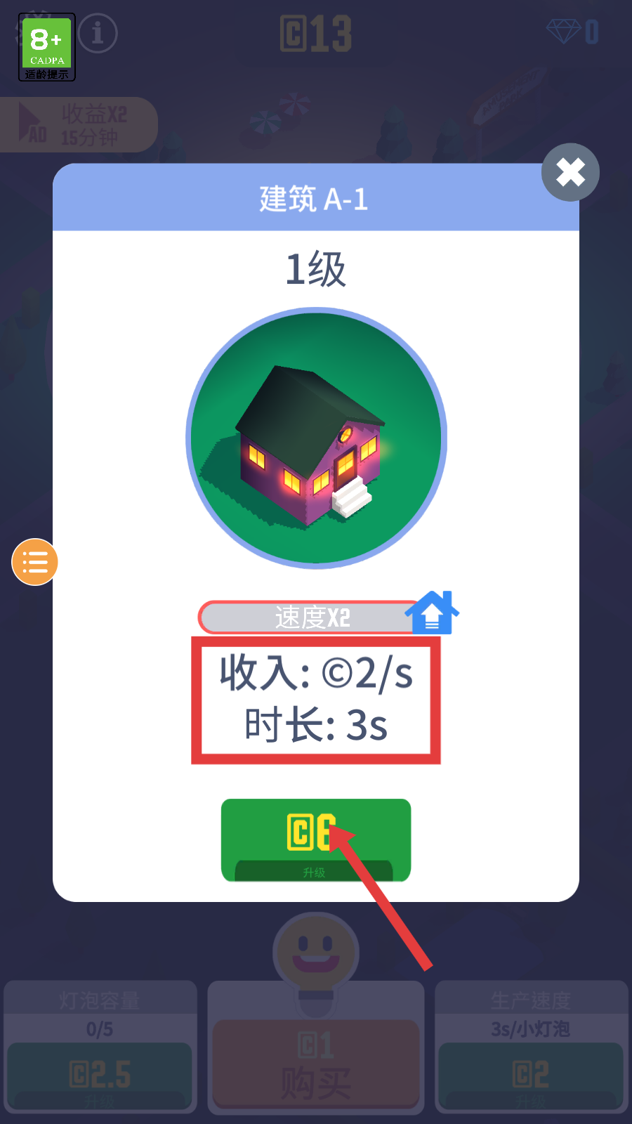 4、针对【建筑A-1】,消耗资源点【升级】,提升【收入-©2/s】并缩短产出时长。