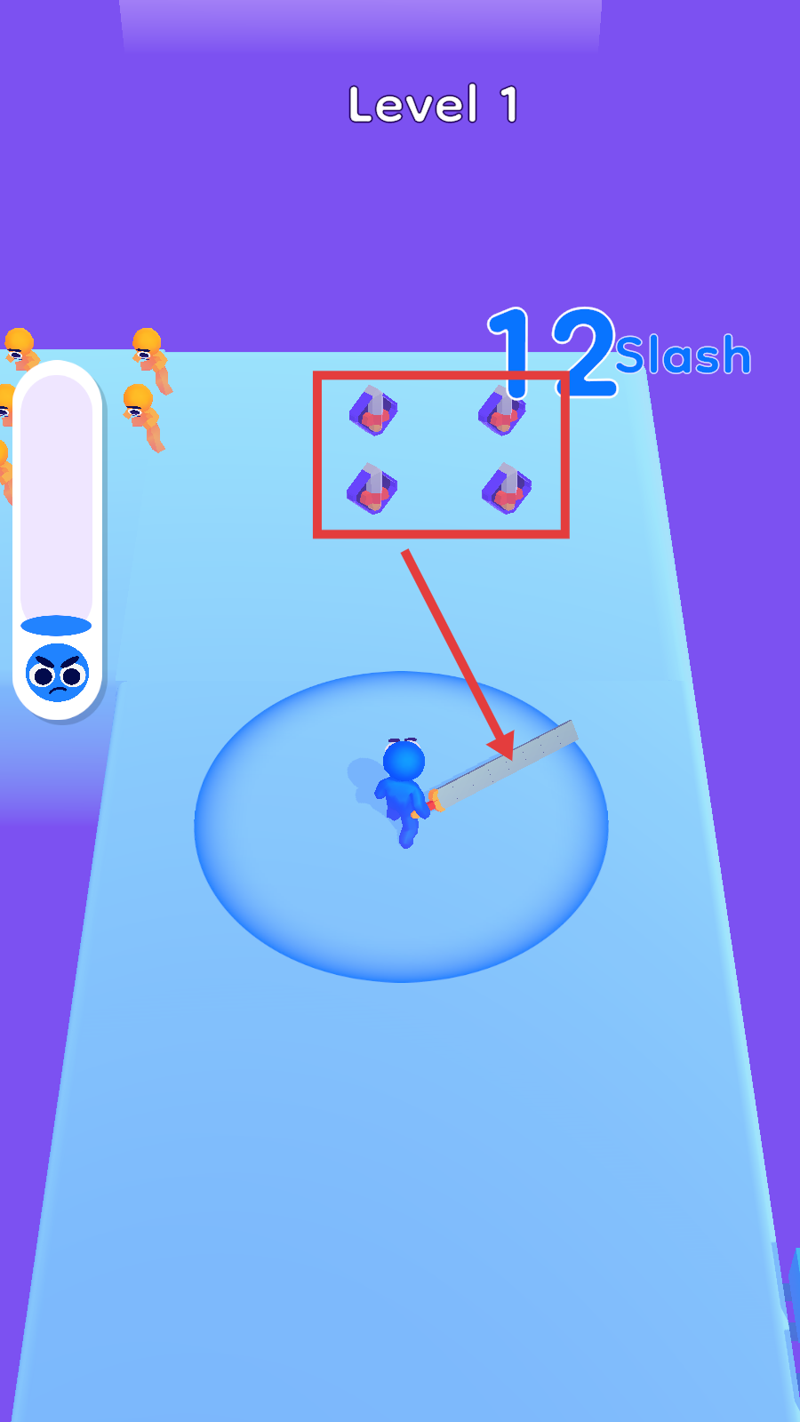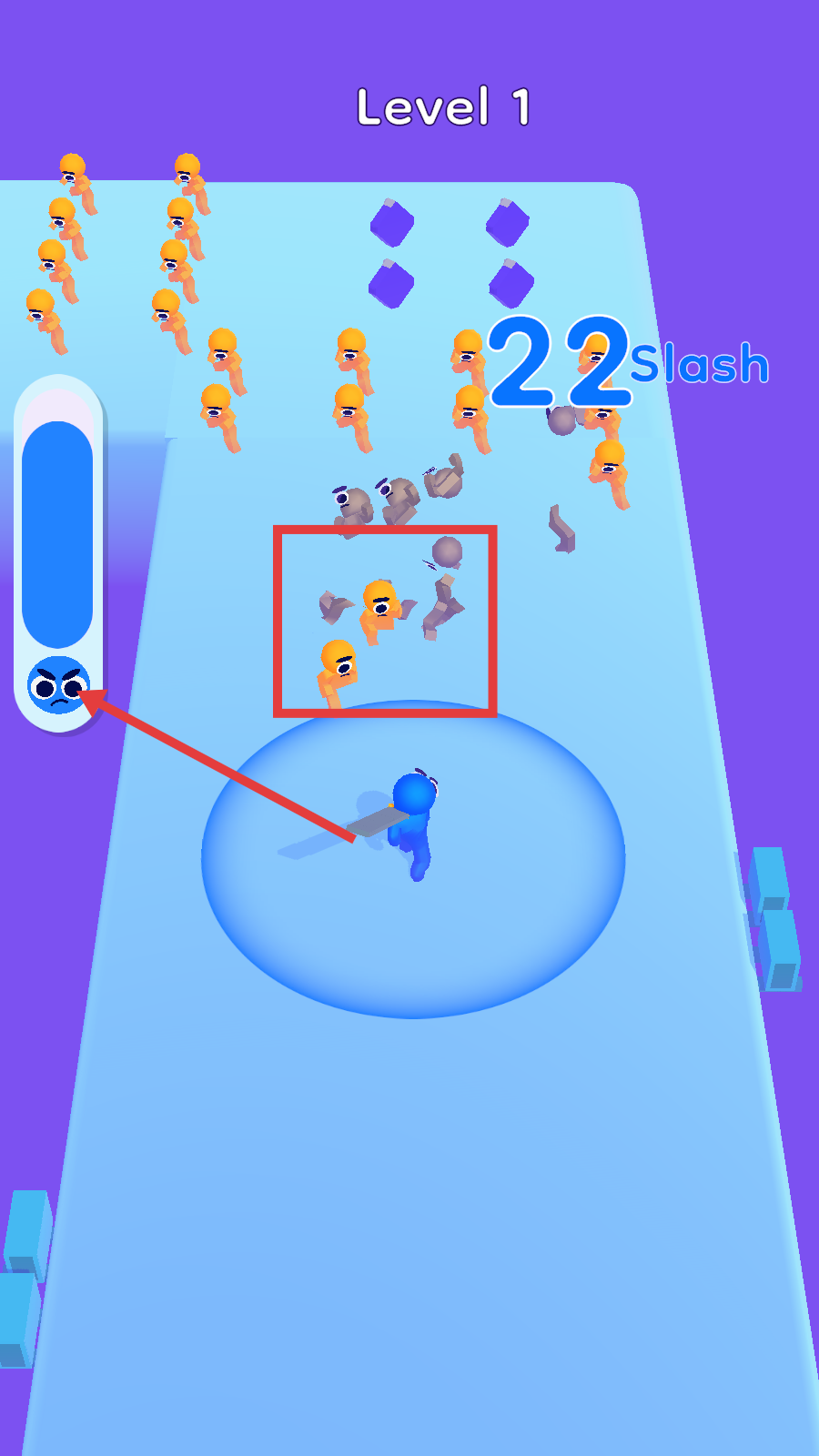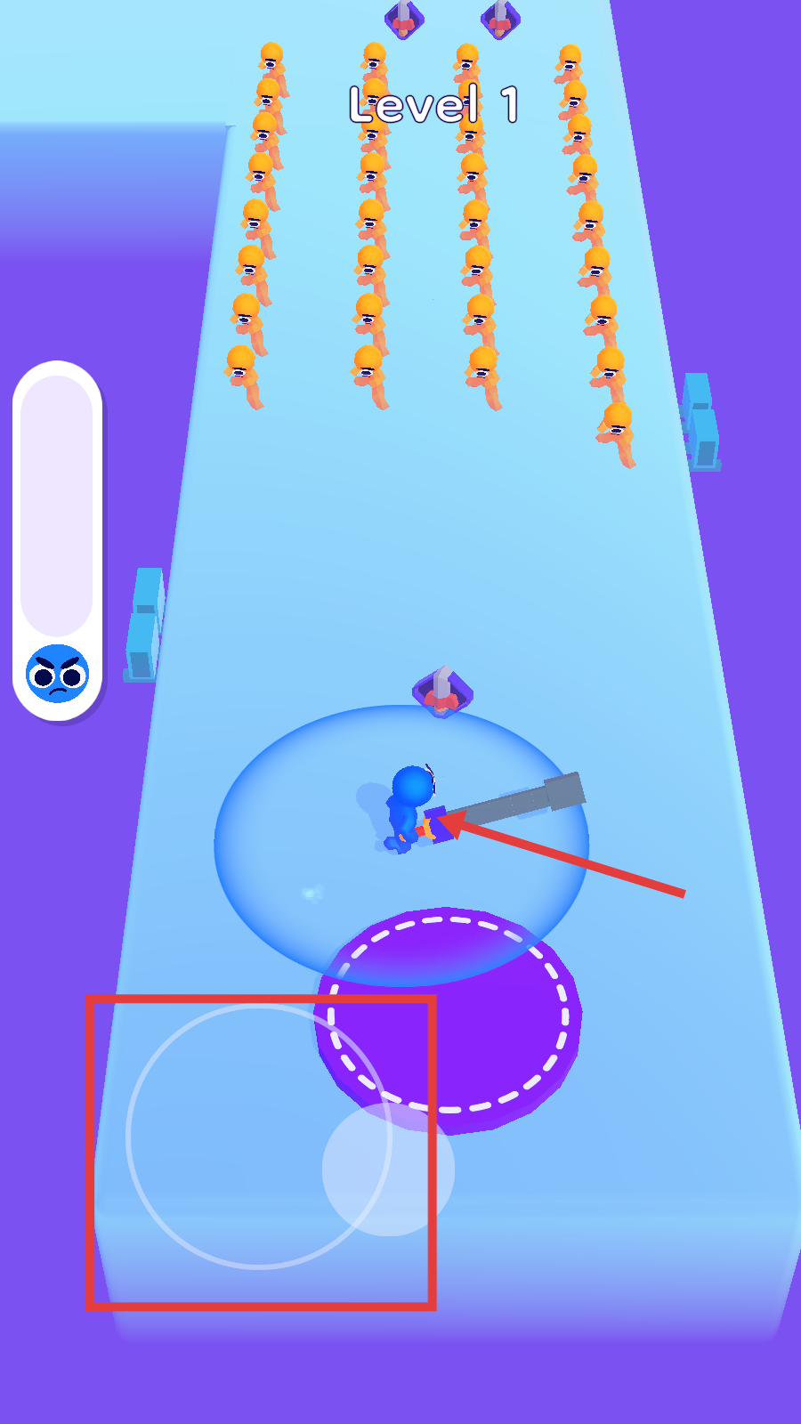 1、Level-1开局,操控蓝色角色捡起地面武器,借助左侧能量条,备战黄色敌人。