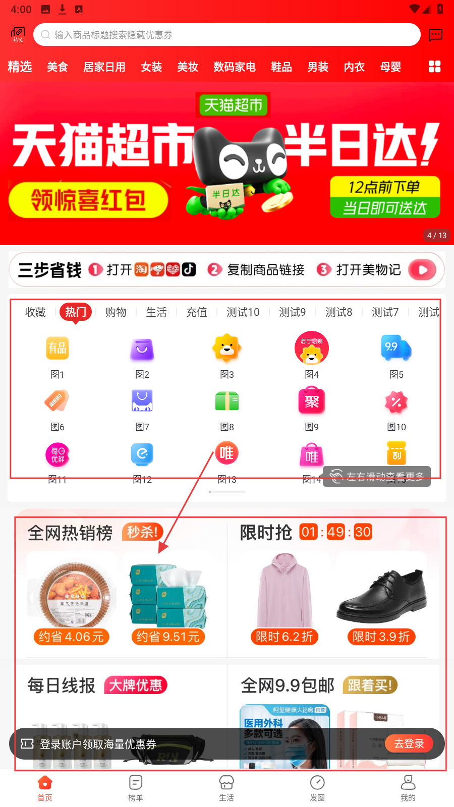 1、进入首页,选【天猫超市】等模块,参与半日达活动,领红包享优惠。
